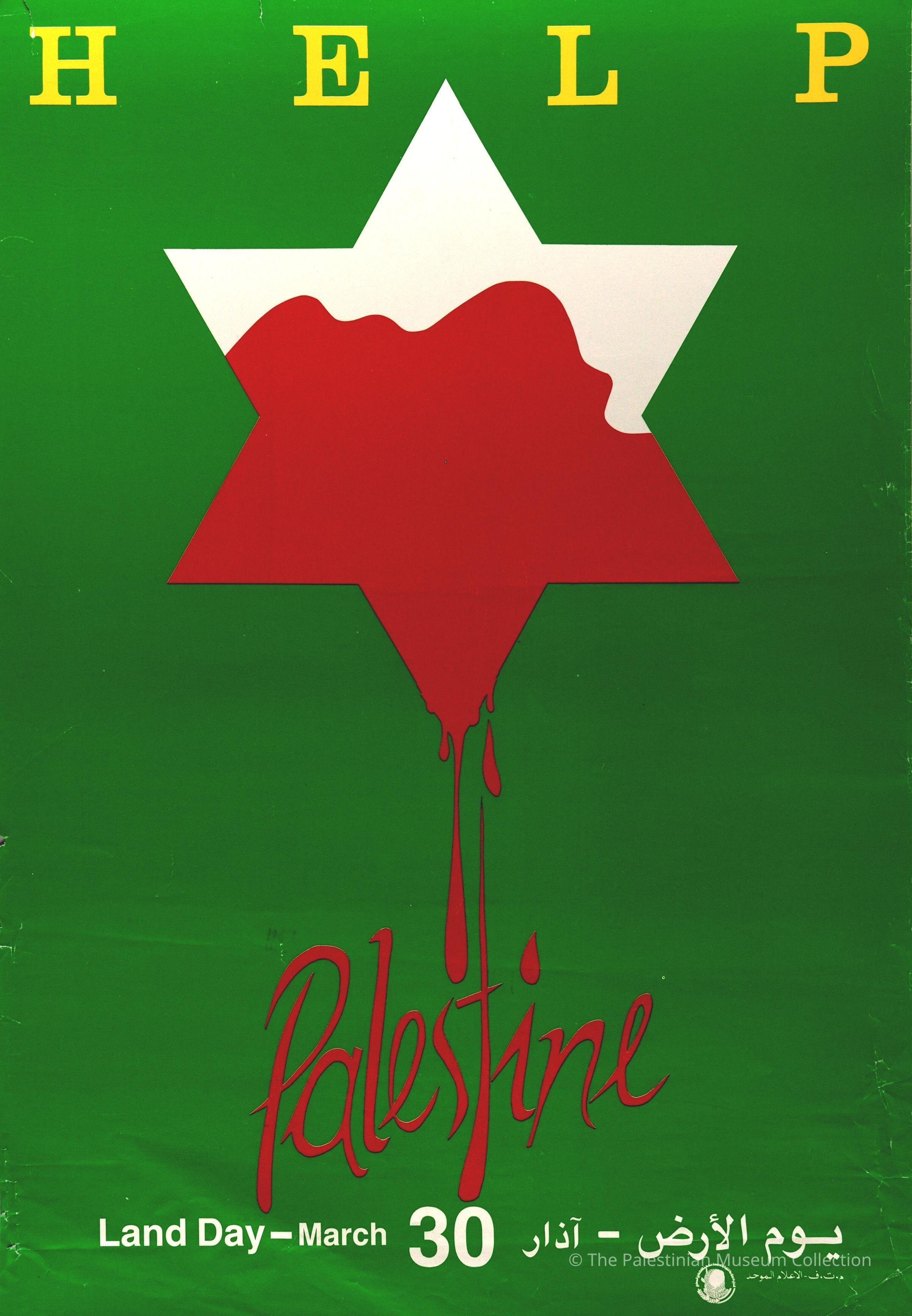 This poster entitled 'Help Palestine' was issued in 1986 by the Unified Information Office of the Palestine Liberation Organisation (PLO) in commemoration of Land Day on March 30th.Dimensions