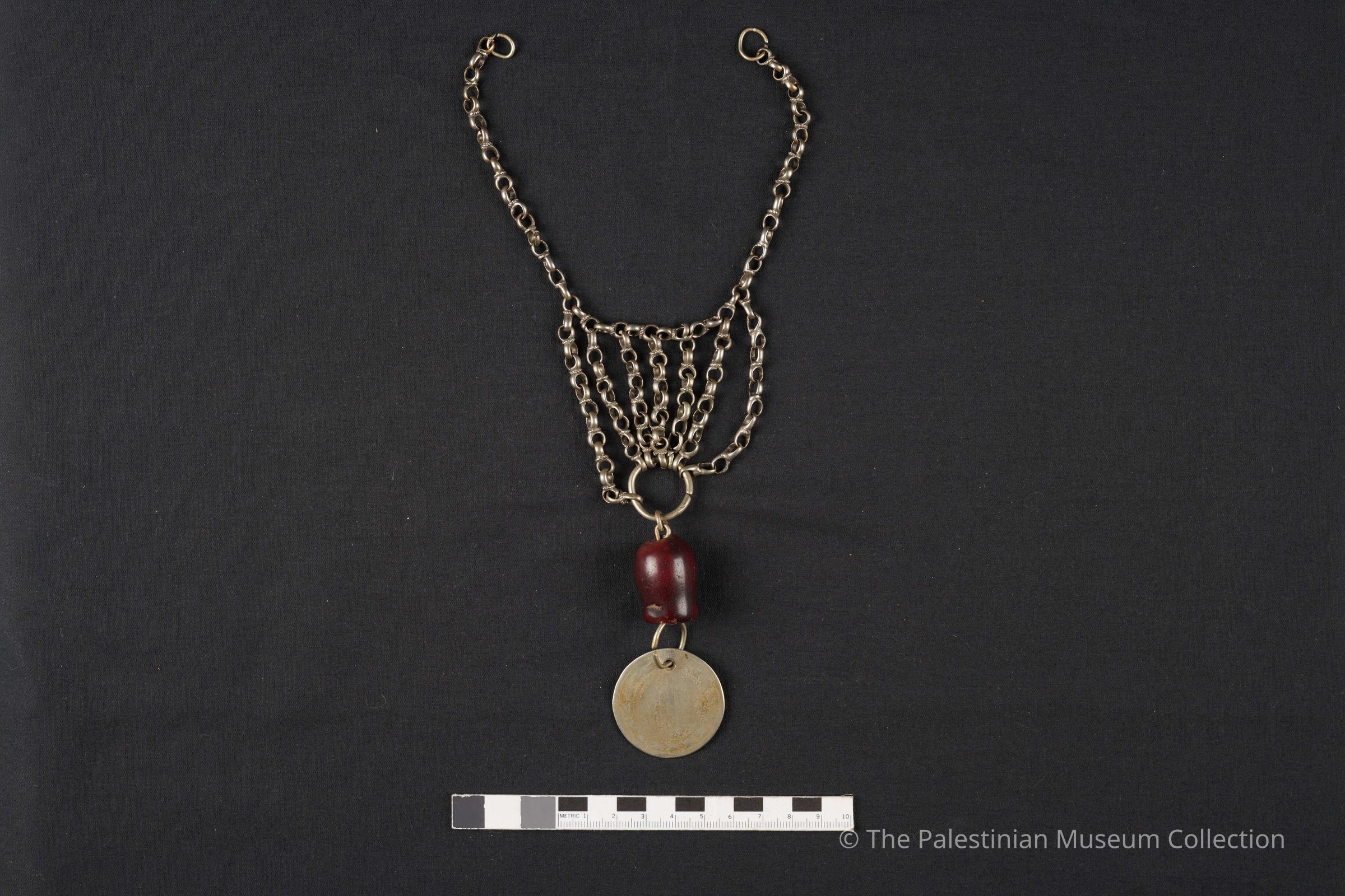 A silver necklace comprised of seven short chains, dangling from which are a red amber bead and a large Ottoman silver coin. The necklace is specific to the Bethlehem regionMade/Created