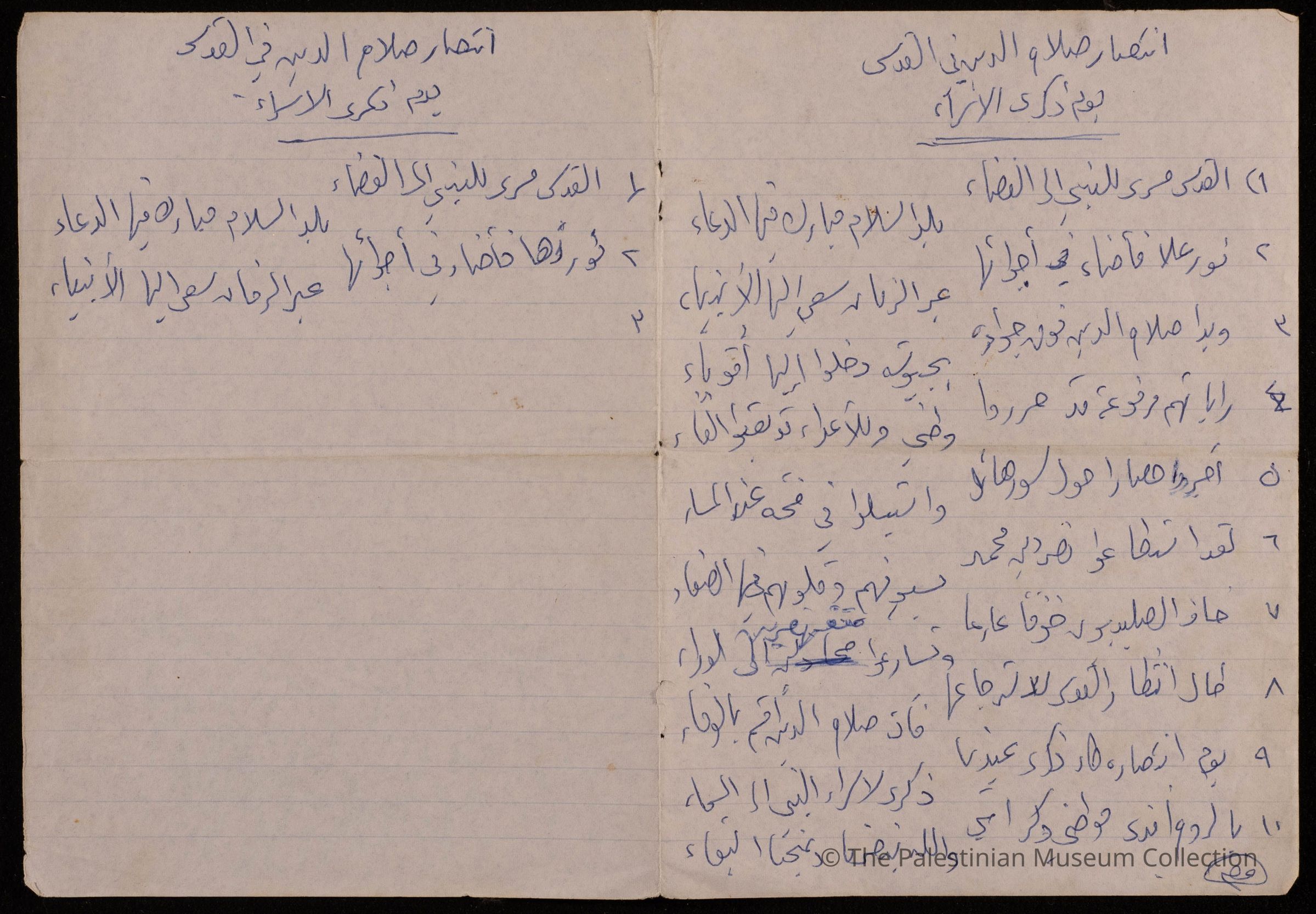مخطوطة قصيدة باللغة العربية بعنوان "انتصار صلاح الدين في القدس يوم ذكرى الاسراء" للشاعرة فاطمة المحب، ولا تحمل الوثيقة أية اشرة الى تاريخ كتابتها.