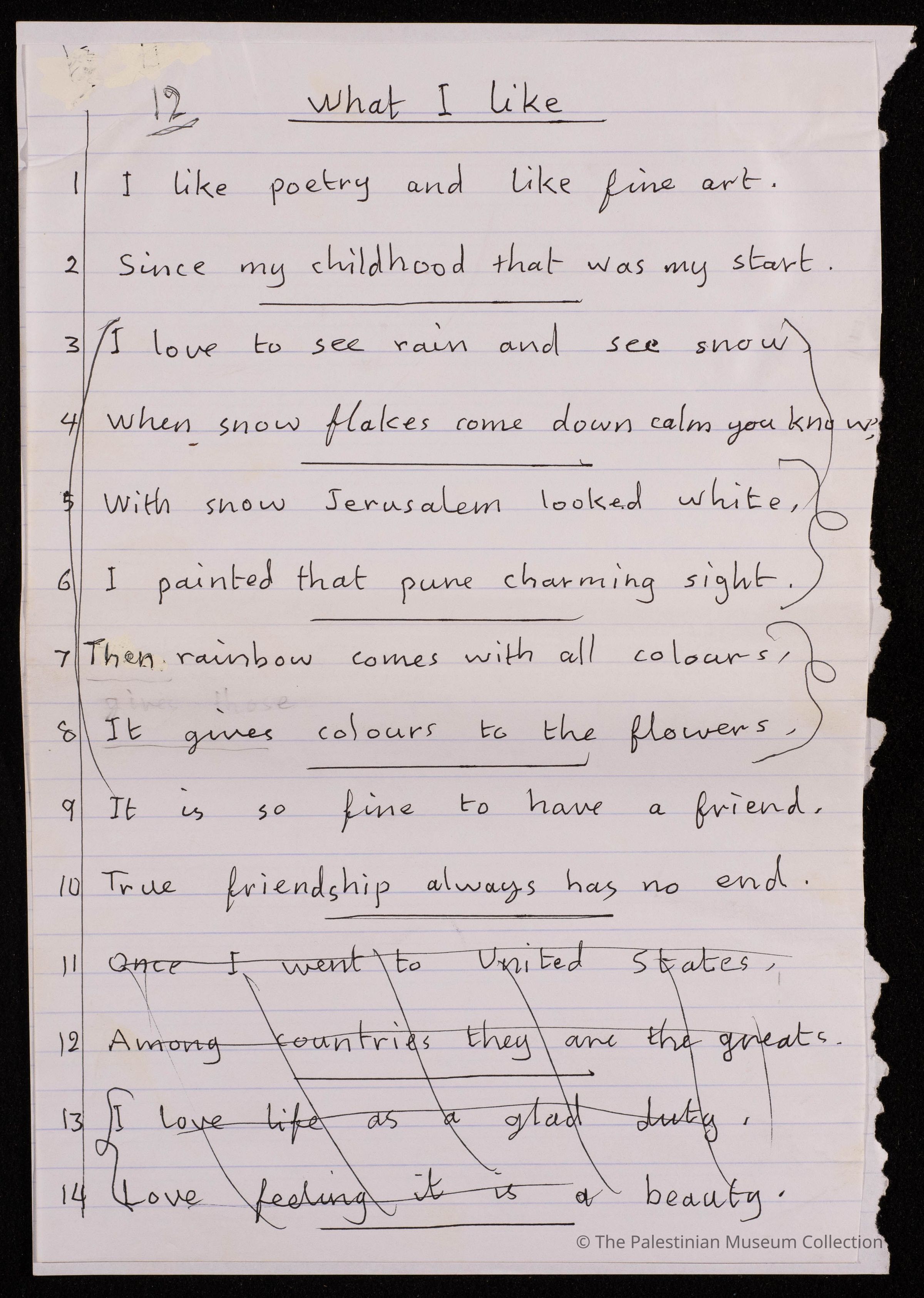 مخطوطة قصيدة باللغة الانجليزية مكونة من 14 بيتا، بعنوان " ما احب- what i like" للشاعرة فاطمة المحب، ولا تحمل الوثيقة اية اشارة الى تاريخ كتابتها .