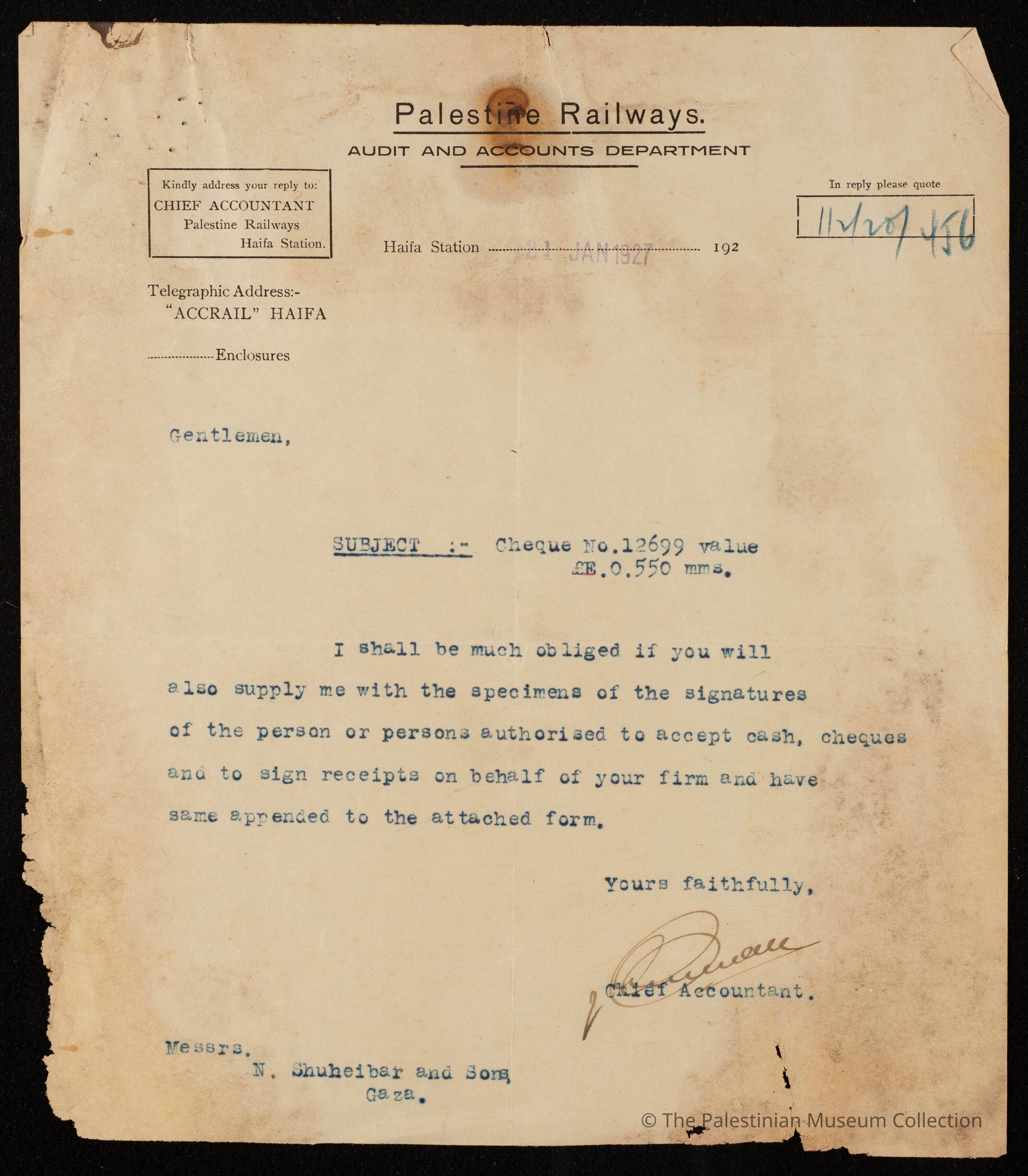وثيقة رسمية صادرة عن دائرة التدقيق والحسابات في سكك حديد فلسطين من محطة حيفا. وهي عبارة عن رسالة موجهة إلى شركة شحيبر وأولاده في غزة بخصوص شيك. كُتبت الوثيقة باللغة الانجليزية.
