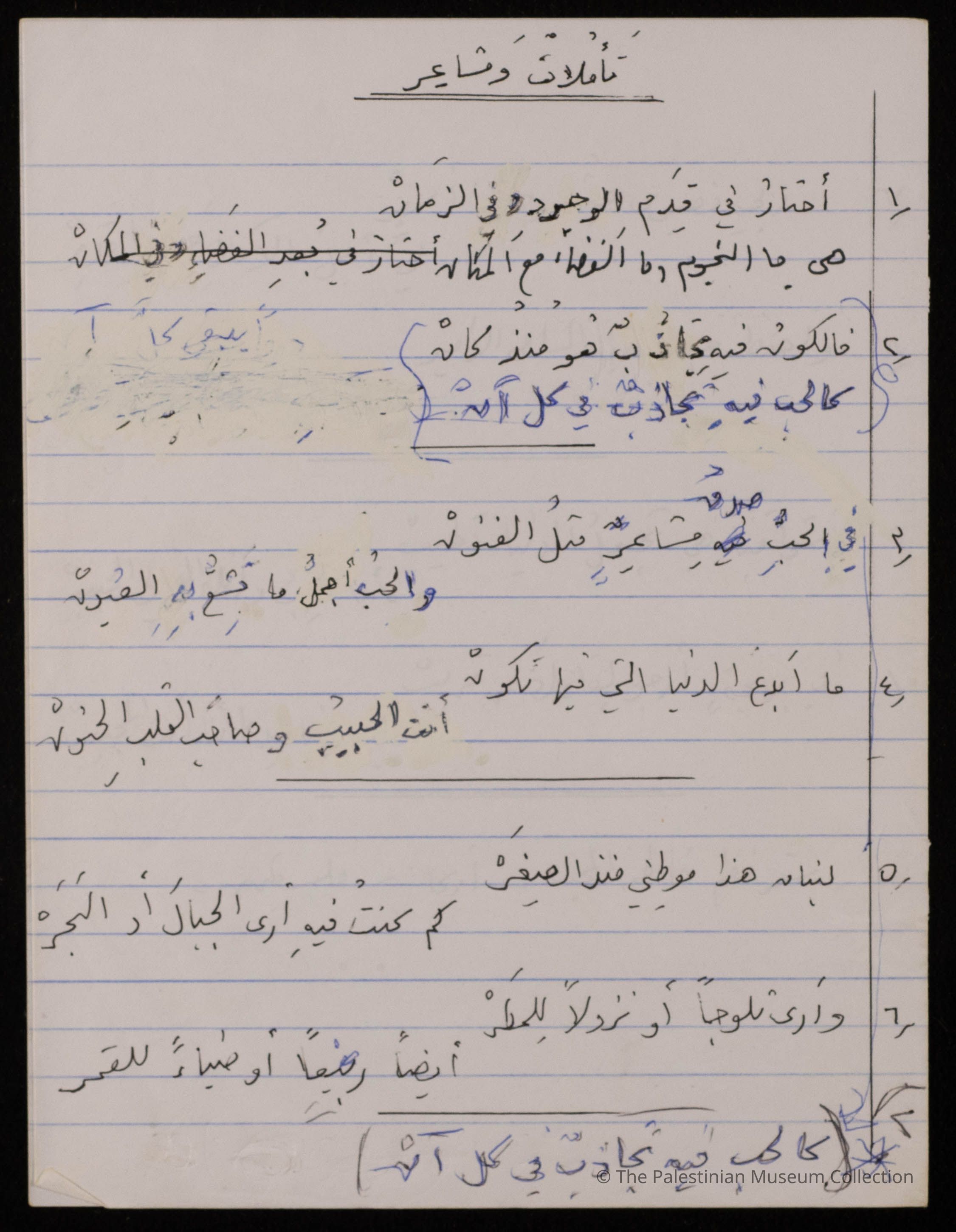 مخطوطة قصيدة باللغة العربية بعنوان" تأملات ومشاعر" للشاعرة فاطمة المحب، نظمت في اريحا- فلسطين، ولا تحمل الوثيقة اية اشارة الى تاريخ كتابتها.