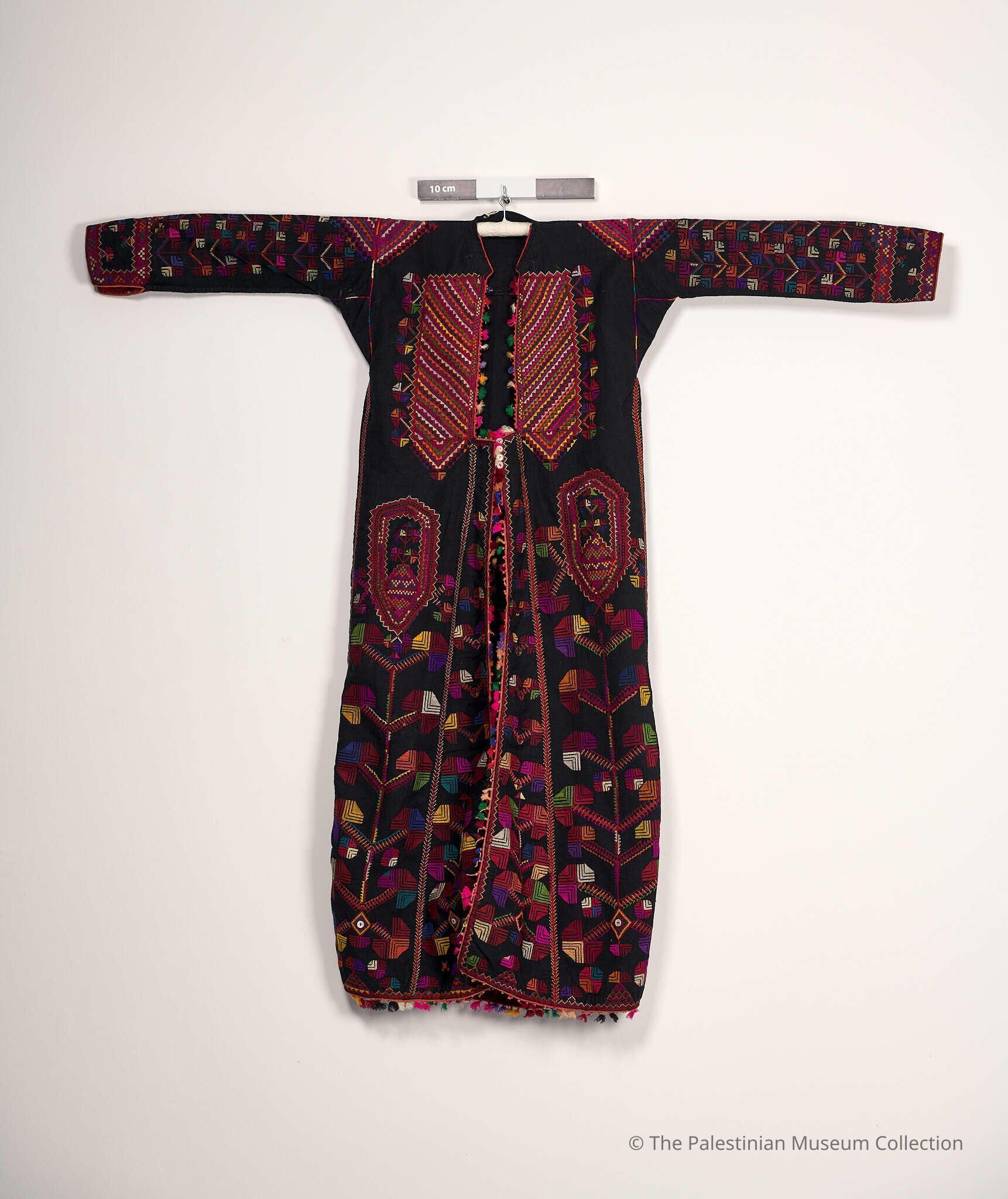 Jalaya (overcoat) thobe from Galilee. It is made of black linen, with embroidery influenced by the Syrian style, featuring primarily red and pink silk threads. The jalaya is distinguished by its heavy tatreez (embroidery). It is open from the top of the chest panel to the bottom of the thobe in a form of a coat with buttons on the chest area. The chest panel of the jalaya is embroidered with geometric shapes and is framed with zigzag tashrifi motifs. As for the Nayashin (medal), they are embroidered with geometric shapes. The sleeves are embroidered with feather motifs, whereas the cuffs have a tatreez of geometric shapes. The front panel has the same embroidery as the chest panel and the sleeves. As for the back panel, it has a tatreez of feather motifs. The sides (al-Banayiq) of the jalaya and its tail and slit are adorned with colorful tassels.Made/Created