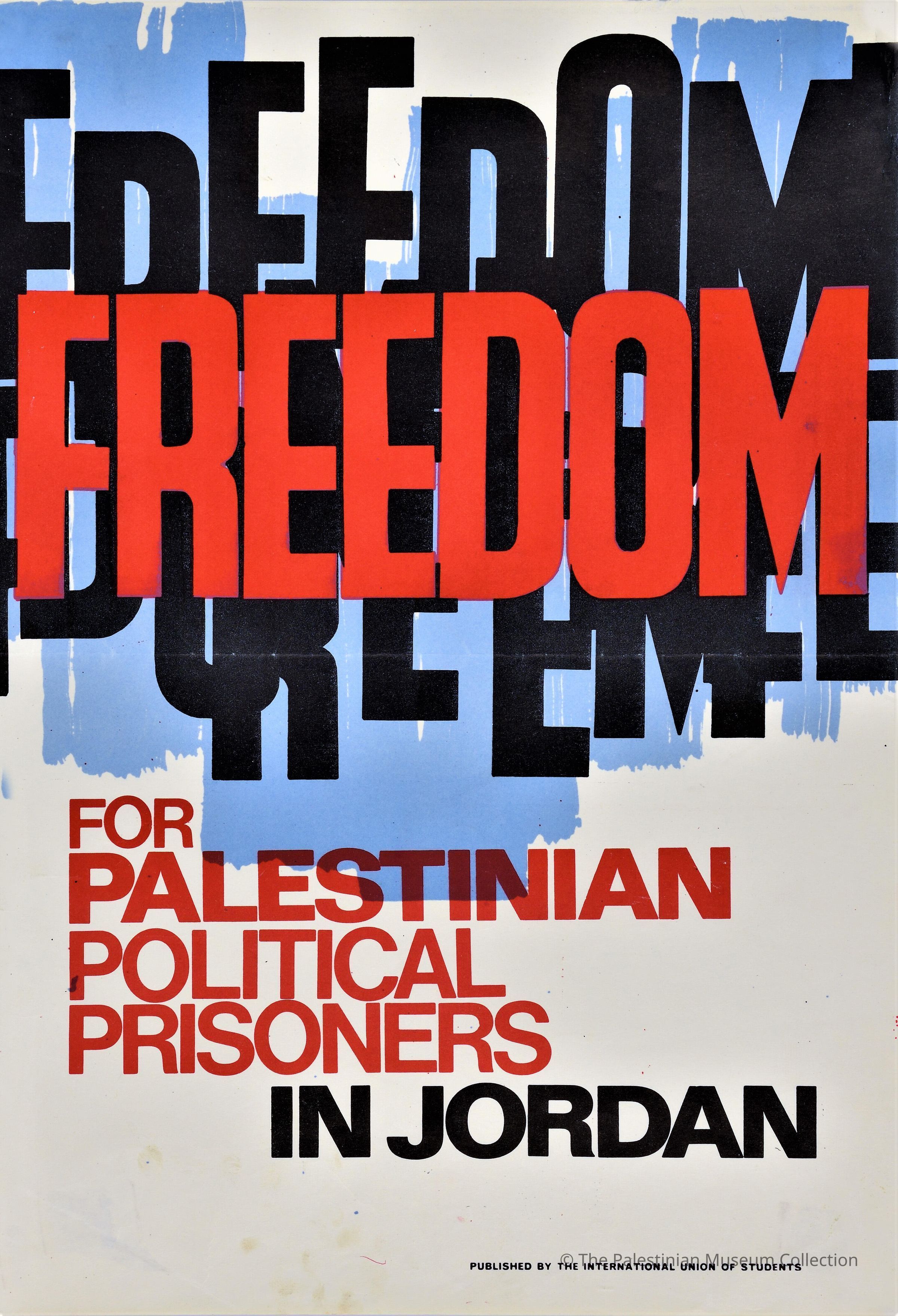 A colour poster showing phrases written for the release of the Palestinian political prisoners in Jordan.Dimensions