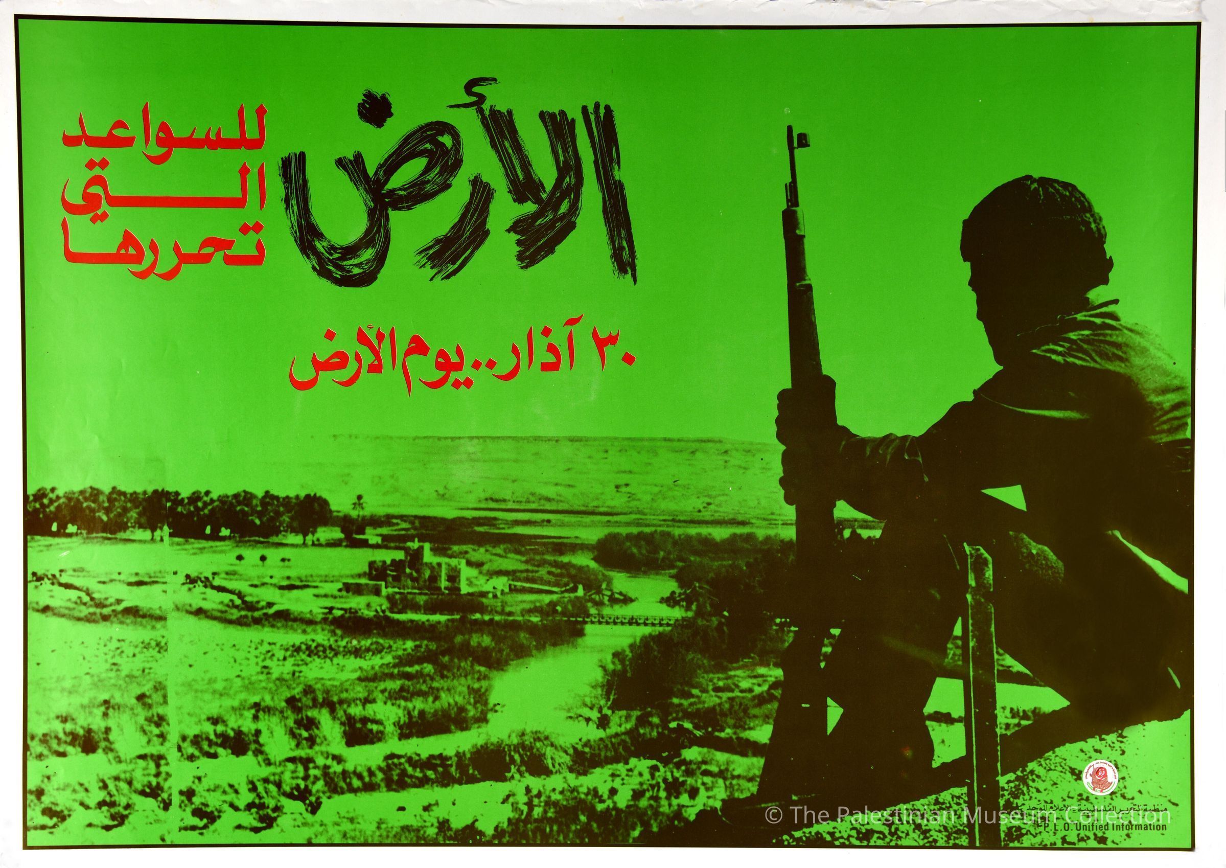 A poster entitled 'The Land is for the Arms that Liberate It' issued by the Unified Information Office of the Palestine Liberation Organisation (PLO) marking Land Day in 1985.Dimensions