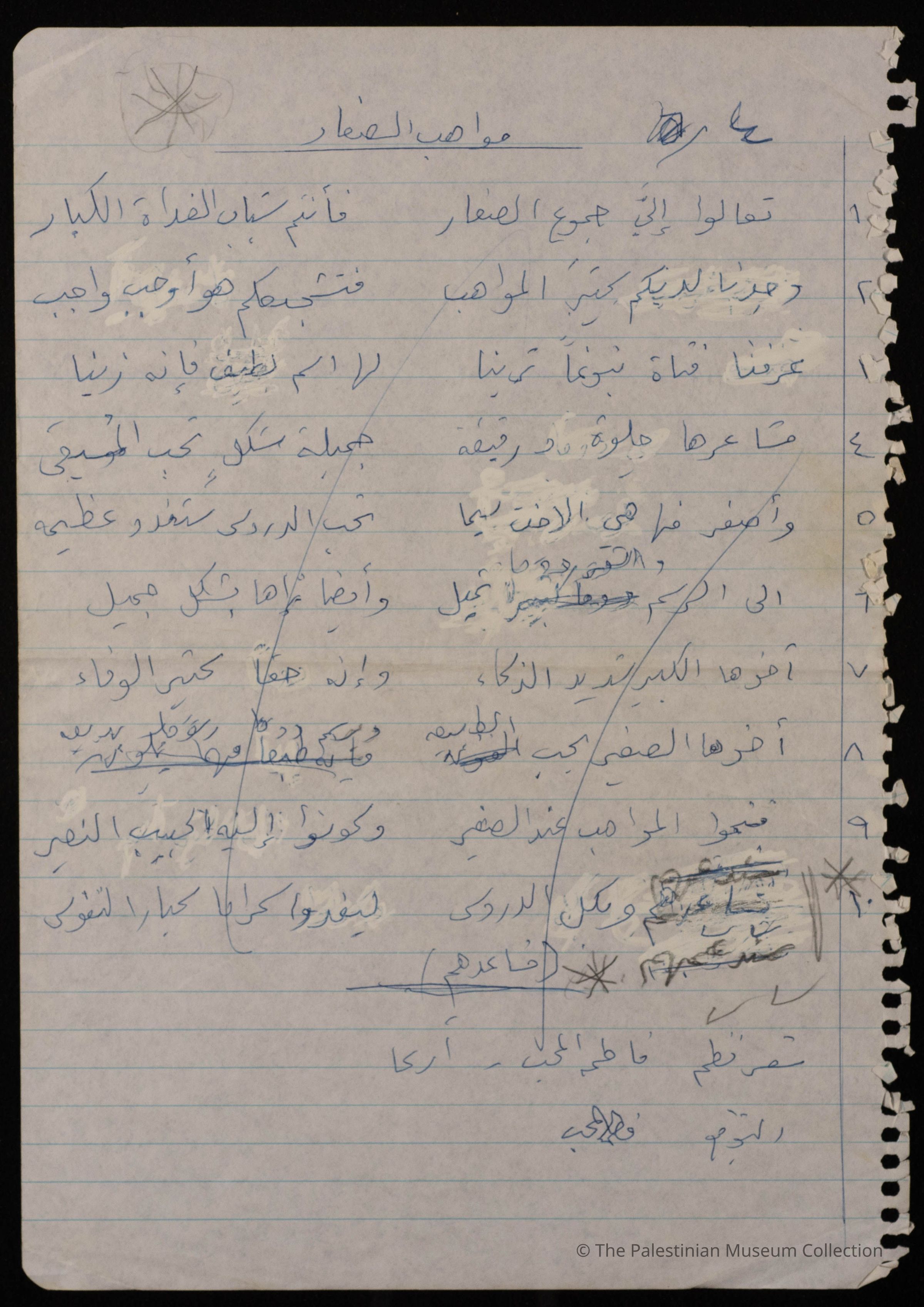 مخطوطة قصيدة باللغة العربية بعنوان " مواهب الصغار" للشاعرة فاطمة المحب، نظمت في اريحا- فلسطين، ولا تحمل الوثيقة اية اشارة الى تاريخ كتابتها.