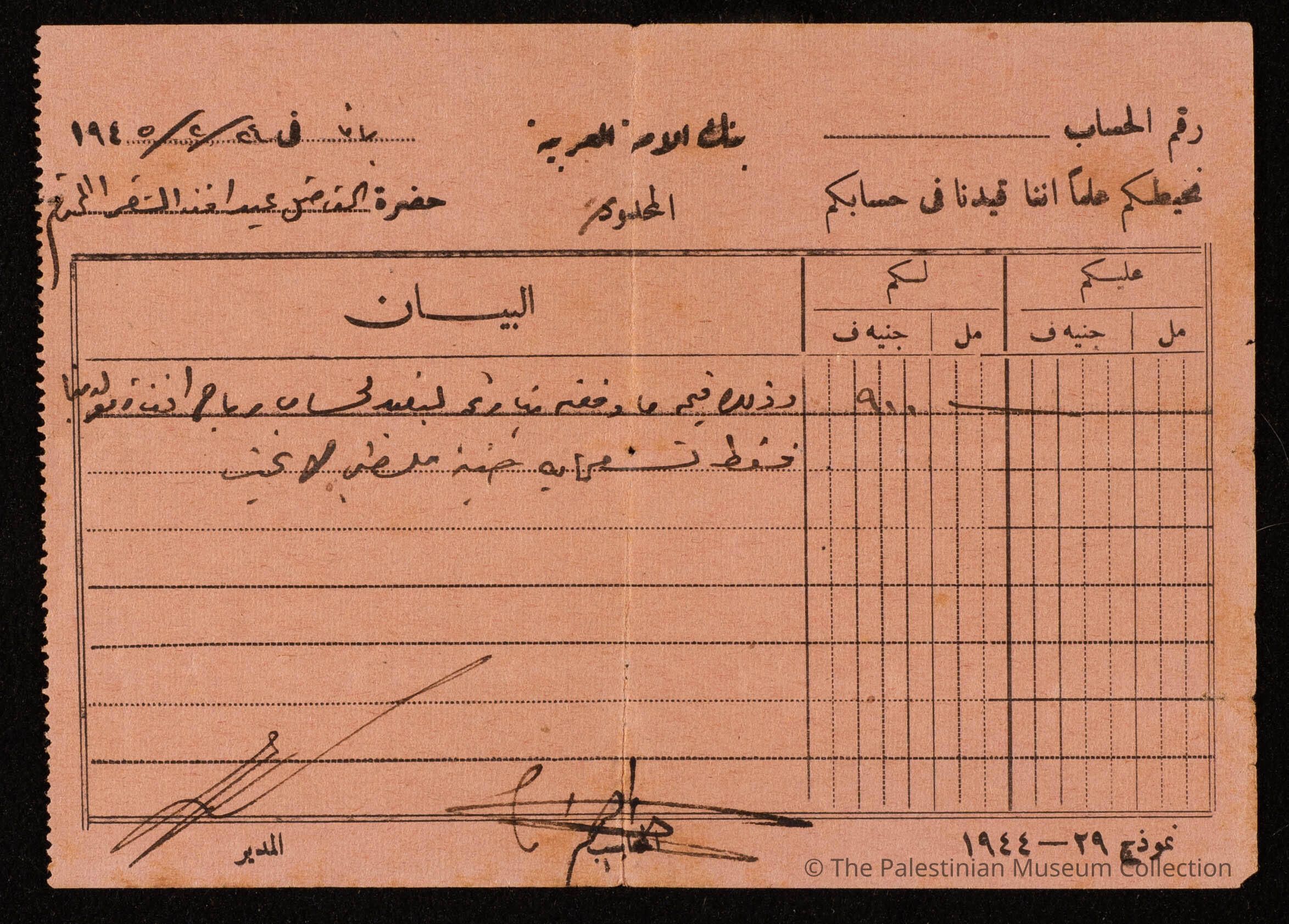 وثيقة تحتوي على معلومات تقييد بنك الأمة العربية حساباً بنكياً بقيمة 900 جنيهاً فلسطينياً بتاريخ 1945.