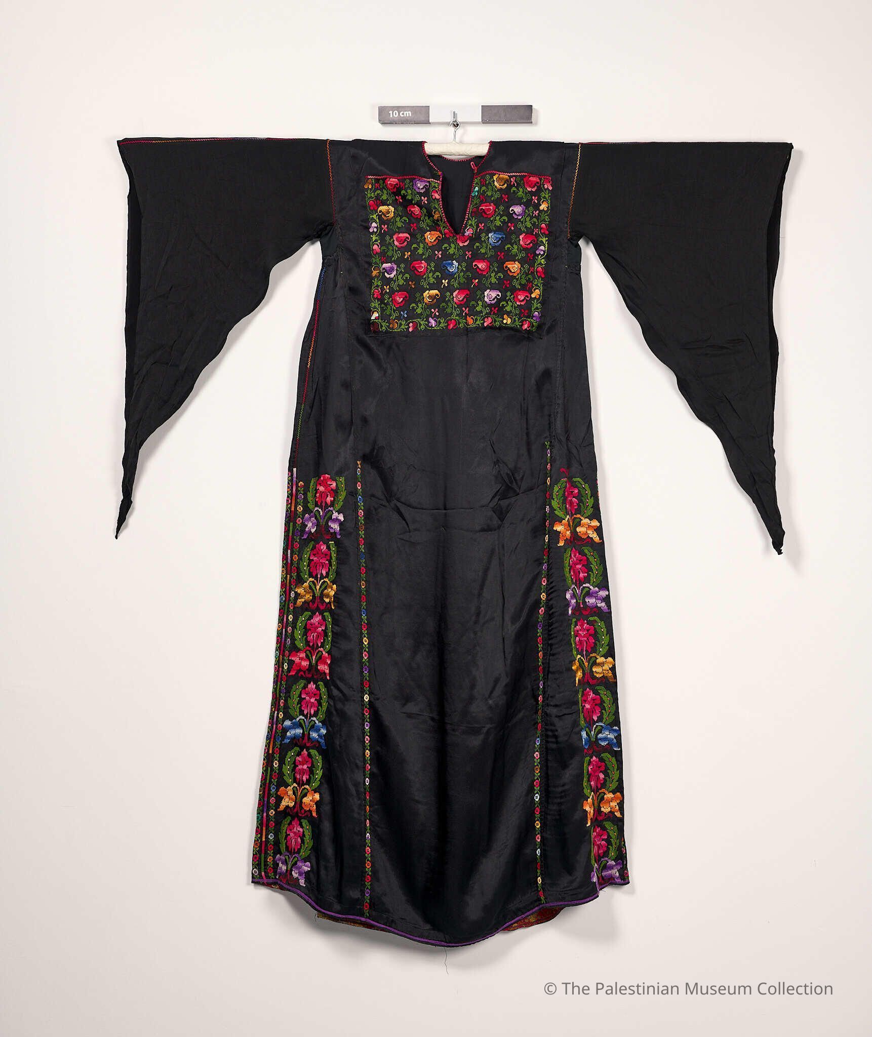 A thobe (dress) from Ad-Dhahiriya, Hebron. It is made of shiny black satin-like cotton (habar) and embroidered with bright multi-coloured silk threads with a Fallahi (peasant) cross stitch. The chest panel of the thobe has a tatreez (embroidery) of plant shapes like roses. As for the shoulders, mradan sleeves (long triangular sleeves), and the back of the chest panel (the upper back neckline), they bear no tatreez. The front and back panel have a thin stitch pattern of plant shapes like roses. Moreover, the bottom of the back panel is embroidered with rose and leaves motifs using a Fallahi (peasant) cross stitch. The sides (al-Banayiq) are embroidered with manajil (sickles) motifs and plant shapes in vivid spring colours.Made/Created