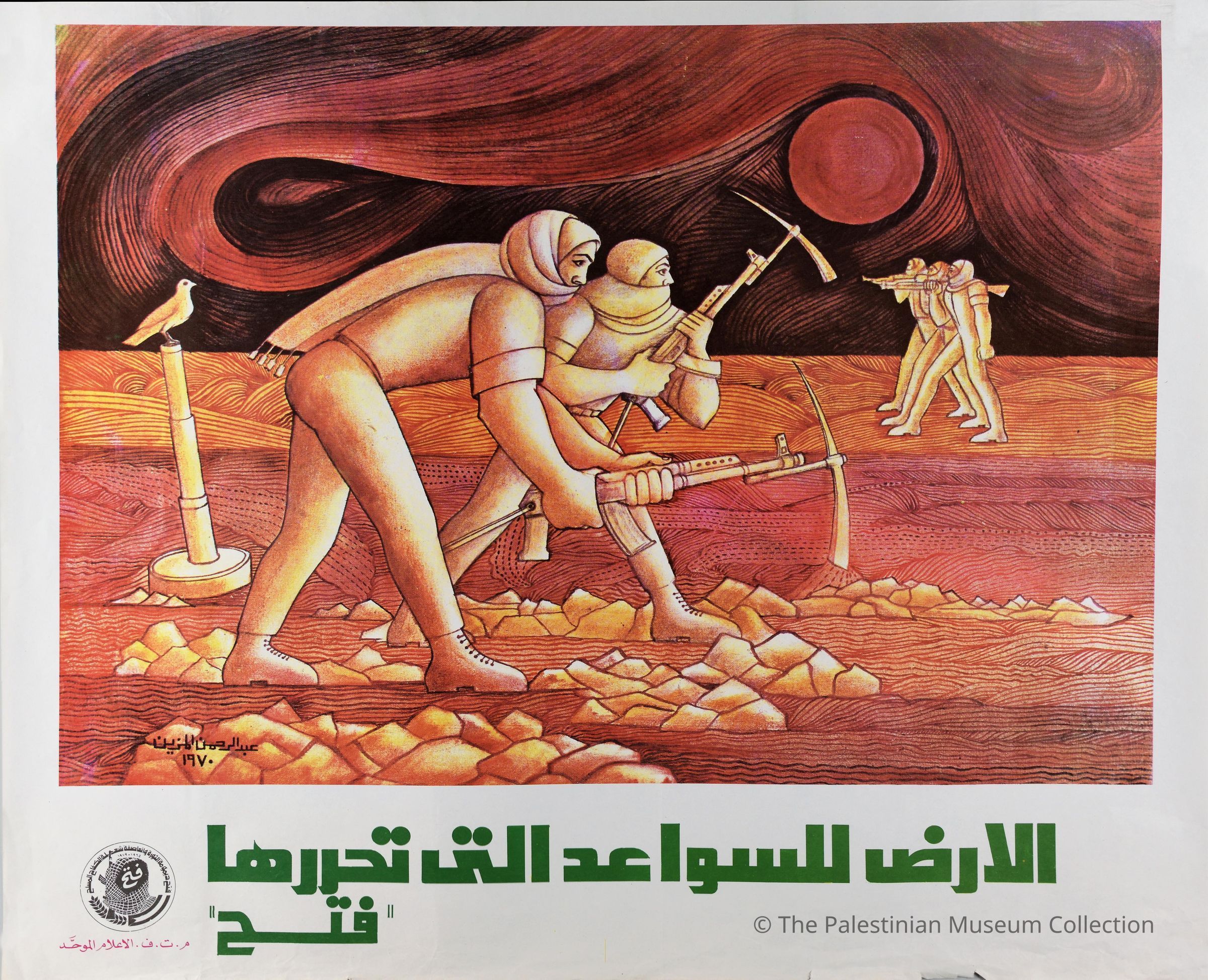 ملصق ملون، يظهر فيه رجال يقومون بحراثة الأرض بالفؤوس المعلقة على البنادق، في الخلف رجال يسيرون حاملين البنادق على أكتافهم.