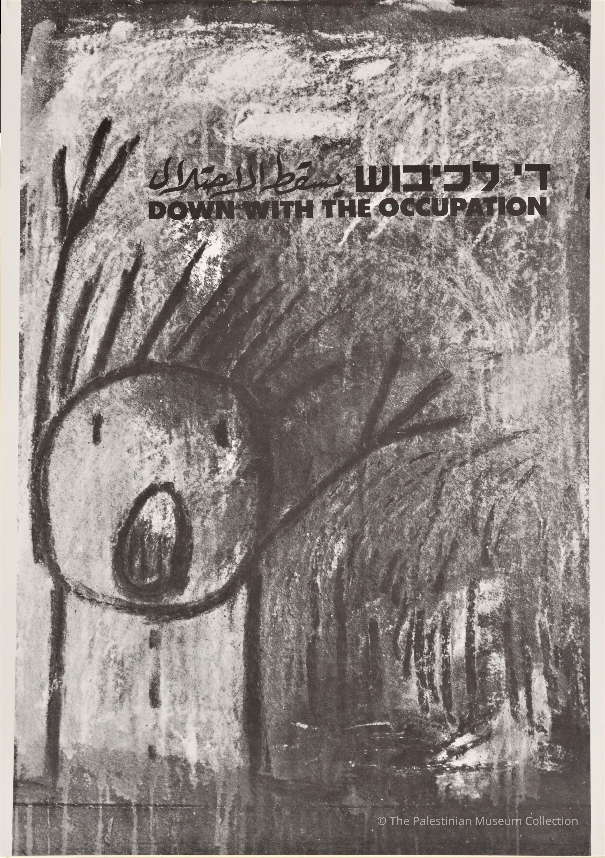 This poster by the artist Hedva Shemesh was part of the 'Down with the Occupation' exhibition held in 1987 by the Association of Artists for Freedom of Expression in the El-Hakawati Theatre in Jerusalem to mark 20 years since the 1967 occupation of the West Bank. The exhibition included posters by Palestinian and Israeli artists.Dimensions