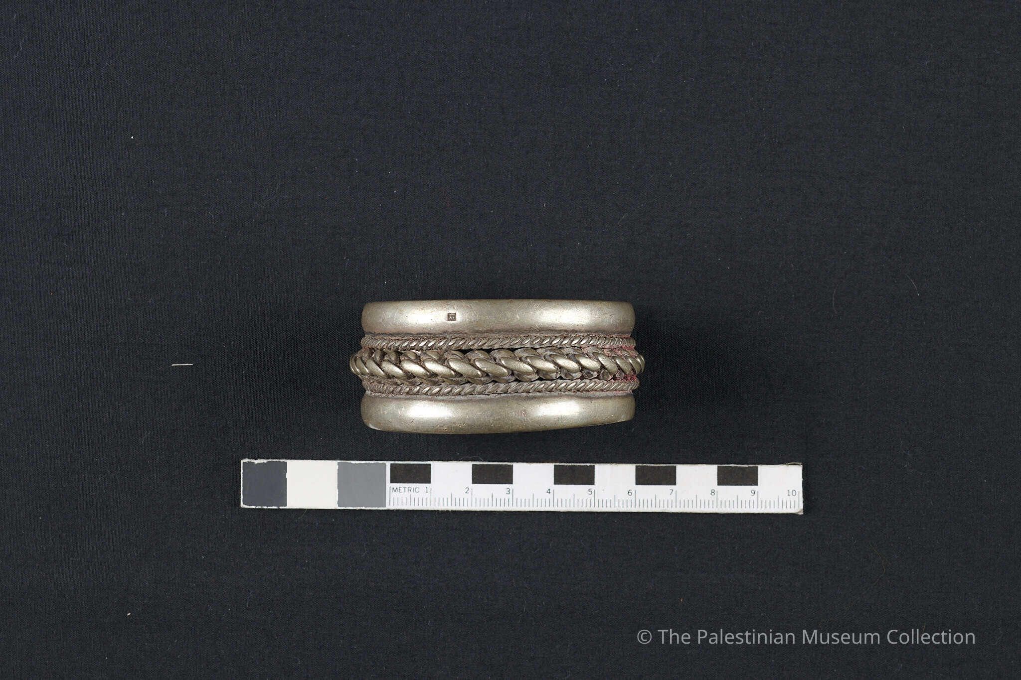 A broad handcrafted bracelet of high-calibre silver consisting of five parts, including two unengraved edges and three braided middle sections, two thin and one thick. The bracelet bears a stamp that determines the quality of silver. It was widespread in the Naqab desert, and its design was influenced by European braceletsMade/Created