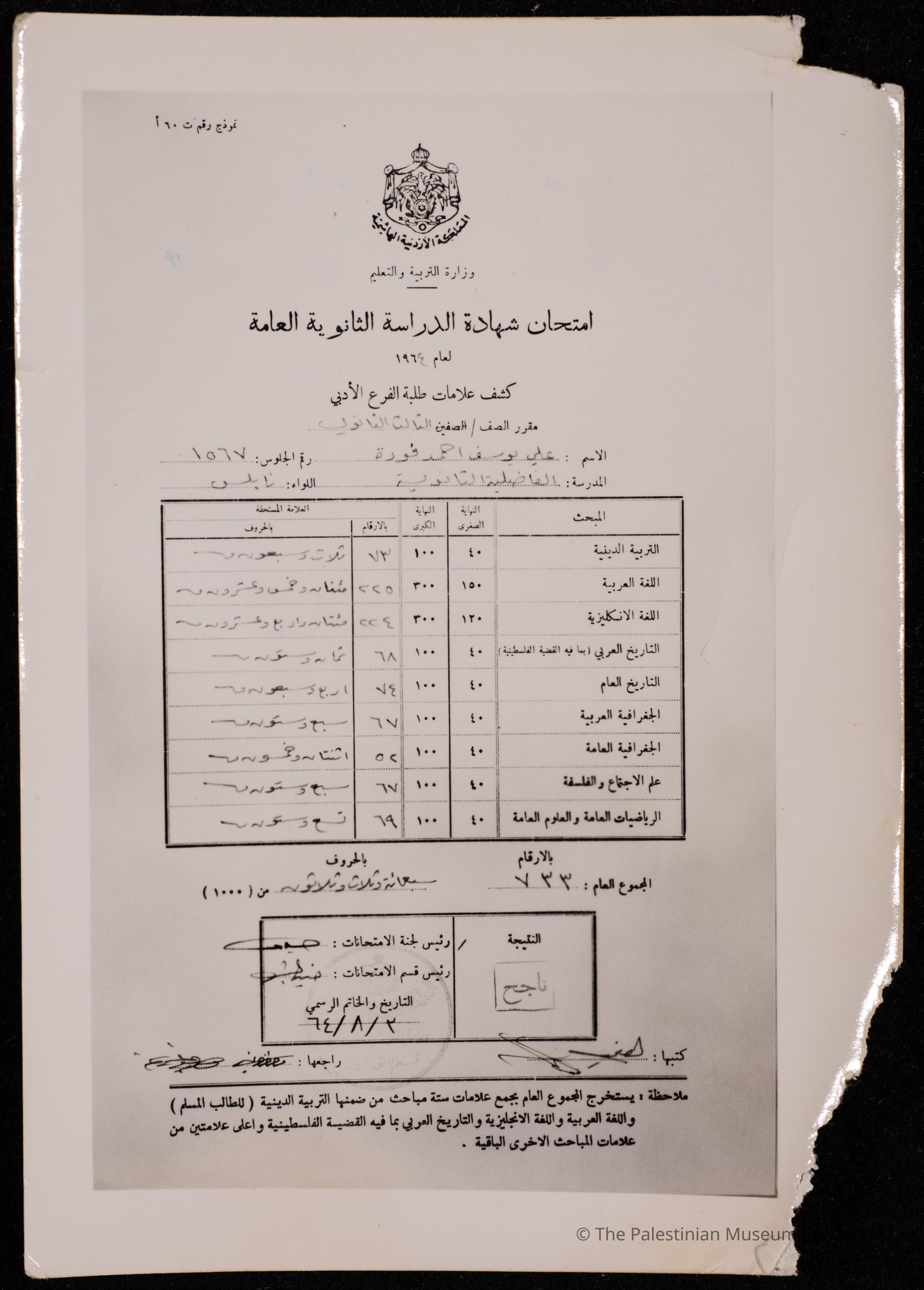A black and white copy of Ali Foda's high school diploma transcript issued by the Ministry of Education in the Hashemite Kingdom of Jordan.Made/Created