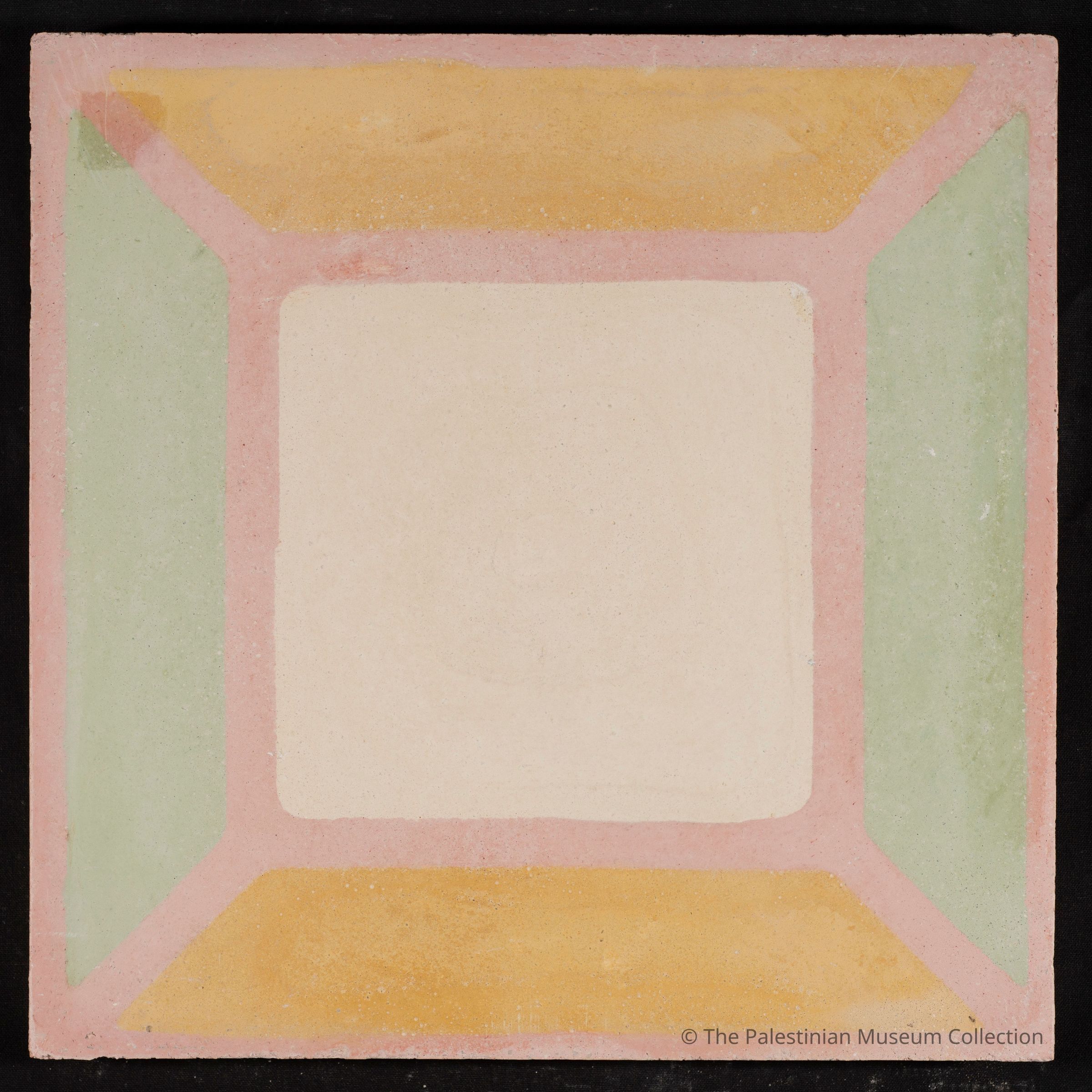 A 20 × 20 cm coloured cement tile. This tile is a contemporary reproduction, cast using an original mold from the Aslan Tile Factory in Nablus.Made/Created