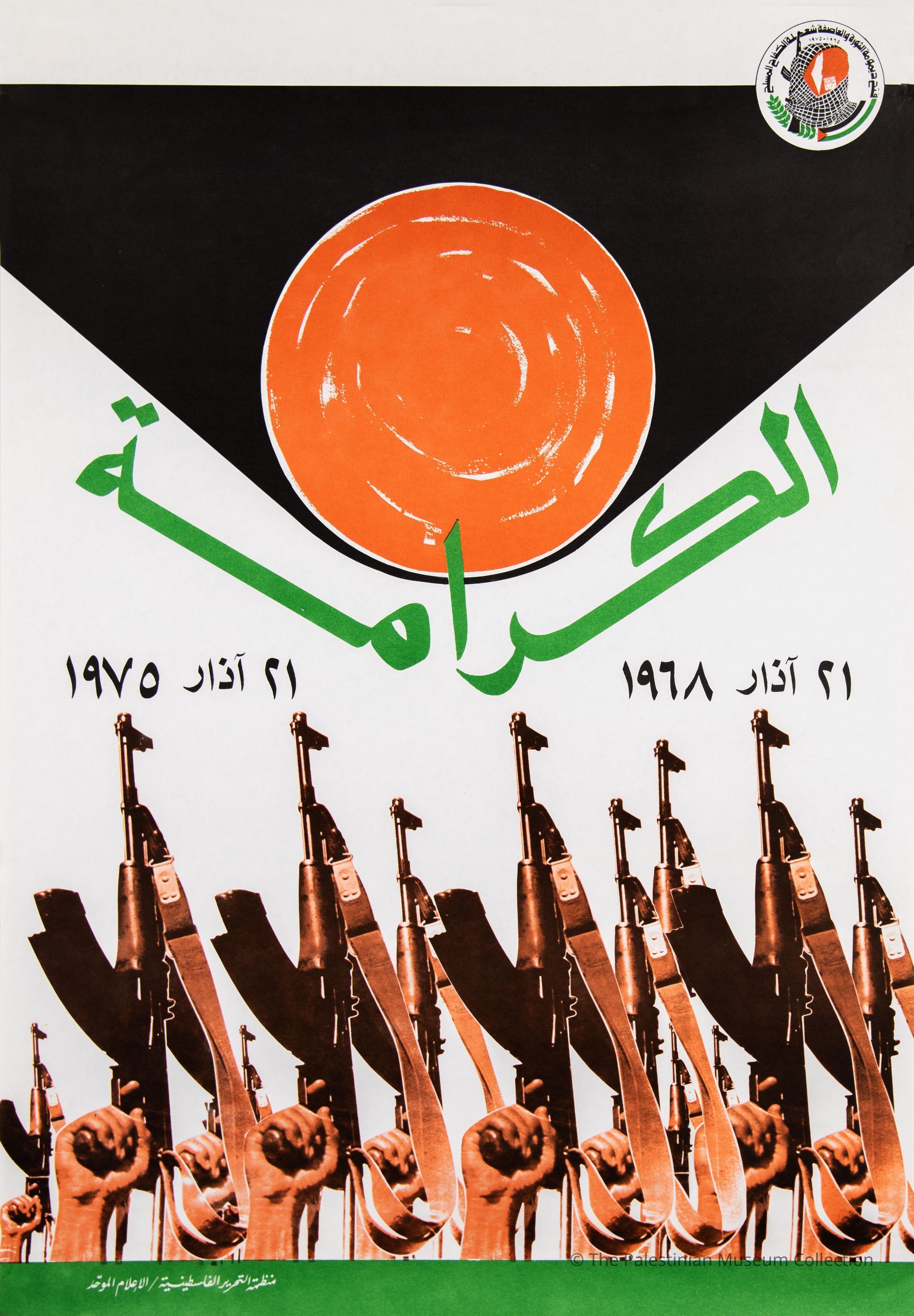 A poster entitled 'Karameh' and issued by the Unified Information Office of the Palestine Liberation Organization (PLO) in commemoration of the seventh anniversary of the Battle of Karameh in 1975.