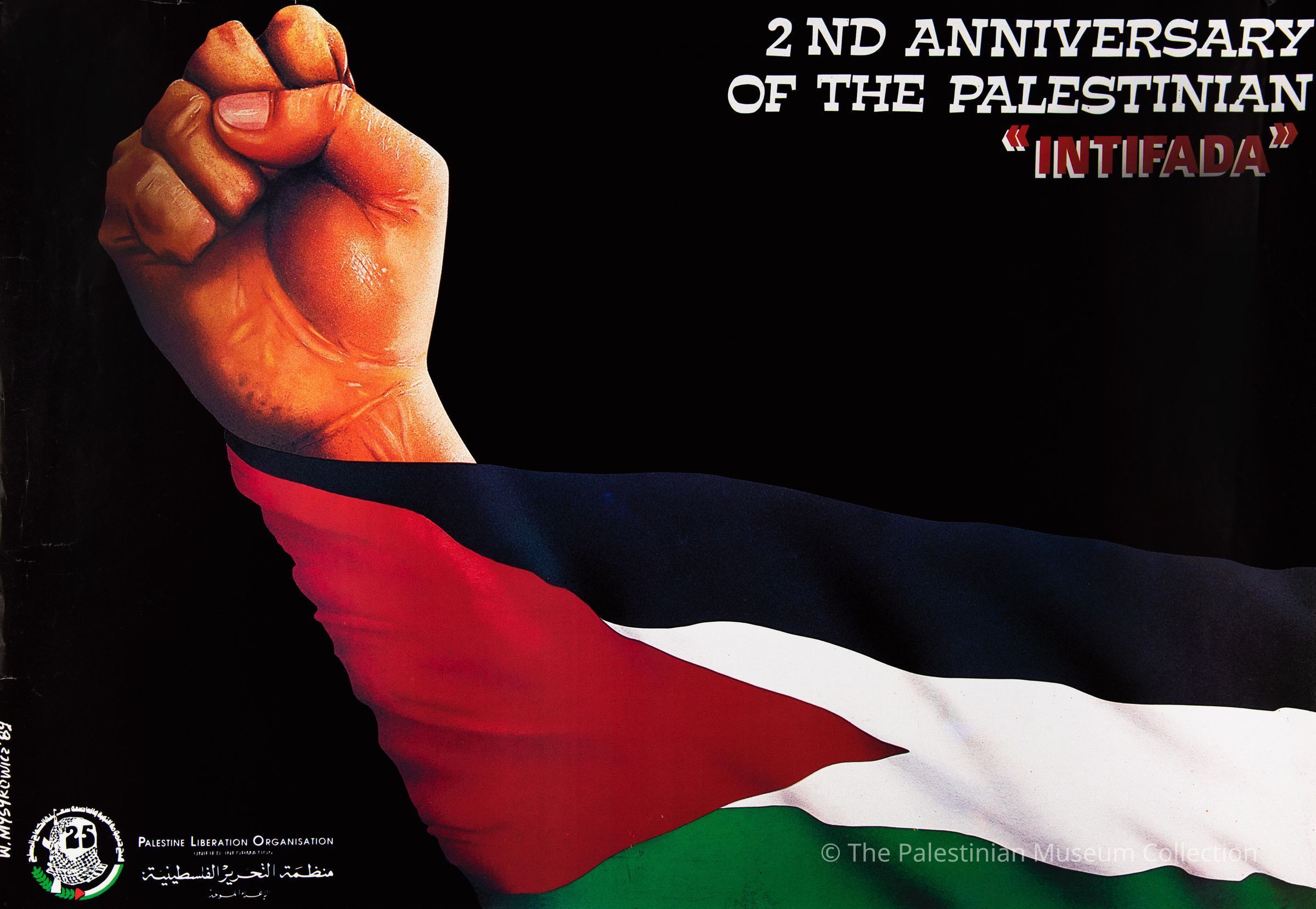 This poster entitled '2nd Anniversary of the Palestinian Intifada' was issued by the Unified Information Office of the Palestine Liberation Organisation (PLO) in 1989.Dimensions