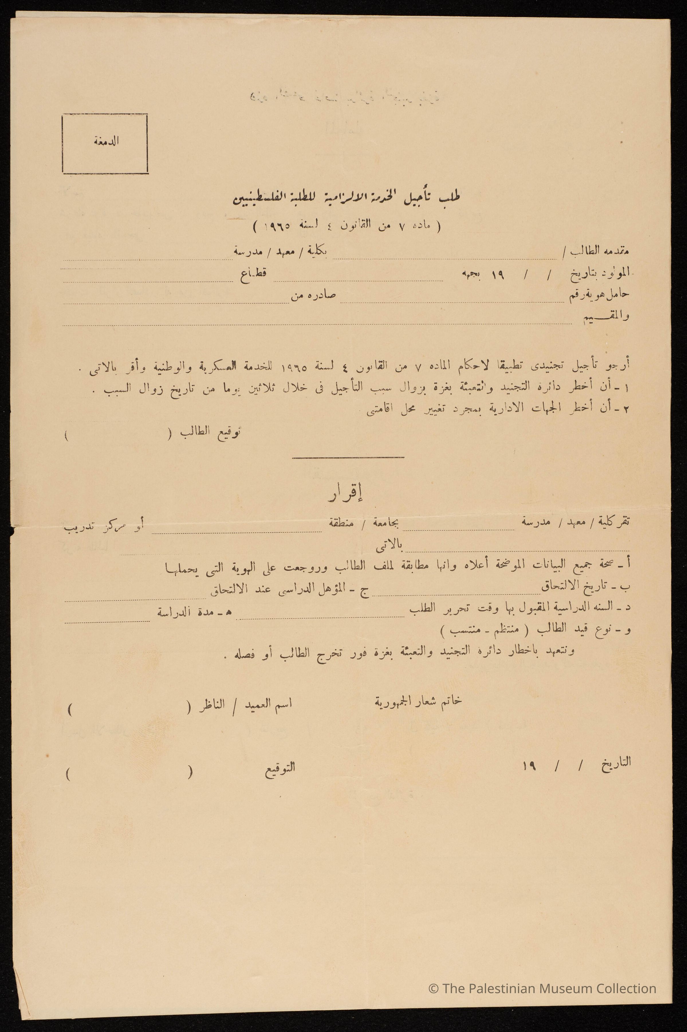 وثيقة تحتوي على معلومات لنموذج طلب تأجيل الخدمة الإلزامية للطلبة الفلسطينيين في الجيش المصري