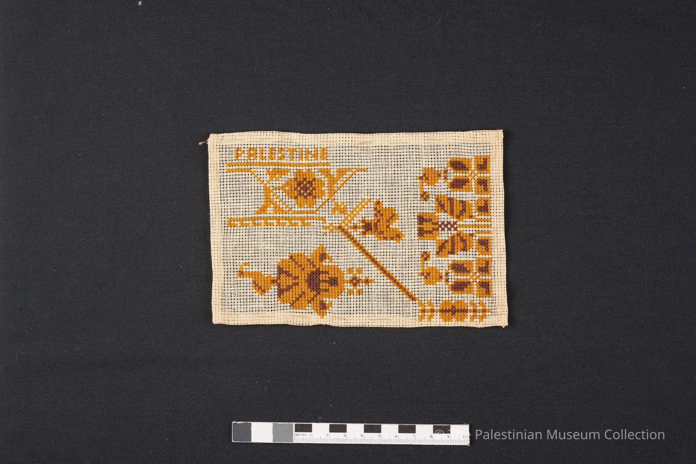 نموذج تطريز على قماش ايتامين بحرير لون اصفر وبني باشكال متعددجة منها كلمة palestine