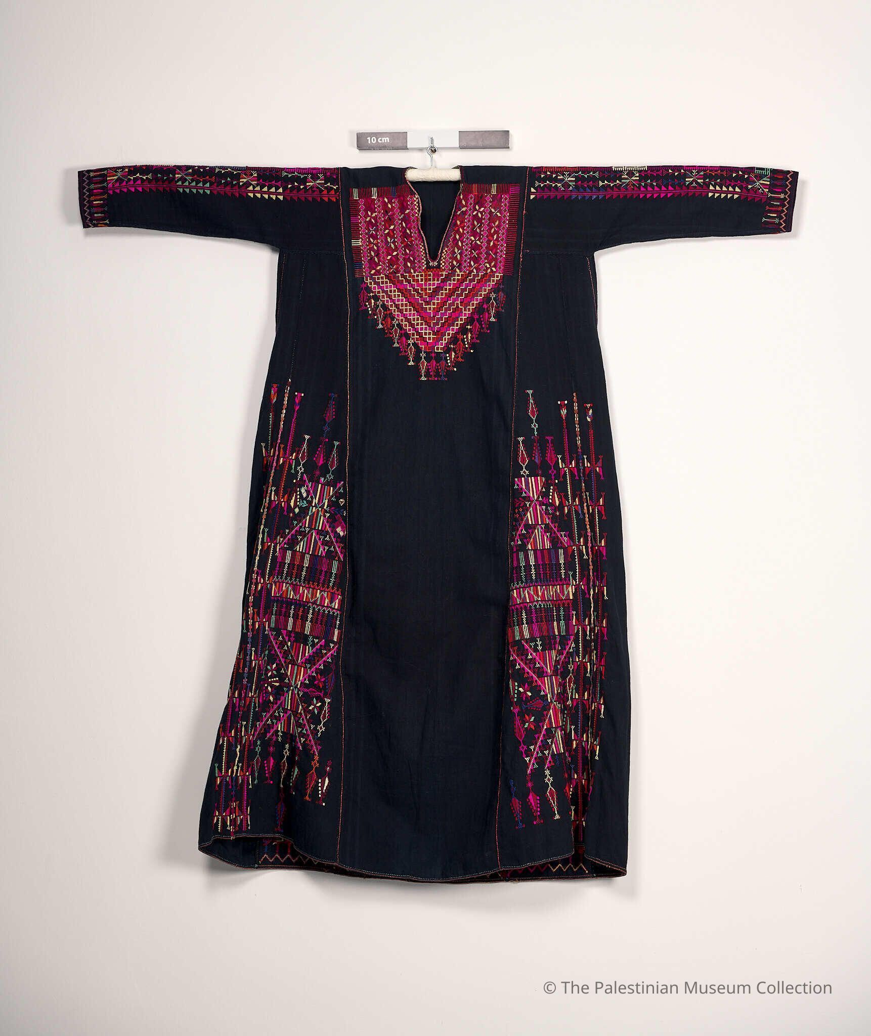 A bridal thobe (dress) from Al-Majdal and Isdud. It is made of cotton and embroidered with primarily pink and fuchsia silk threads with a Fallahi (peasant) cross stitch. The chest panel of the thobe is triangular and embroidered with watch motifs and geometric and plant shapes. As for the shoulders and the back of the chest panel (the upper back neckline), they bear no tatreez (embroidery). The sleeves are embroidered with geometric and plant shapes, whereas the cuffs have a tatreez of cypress and mountains motifs. The front panel of the thobe has no tatreez, while the back panel is heavily embroidered with cypress and mountains motifs. The sides (al-Banayiq) are also embroidered with cypress and mountains motifs along with geometric and plant shapes.Made/Created