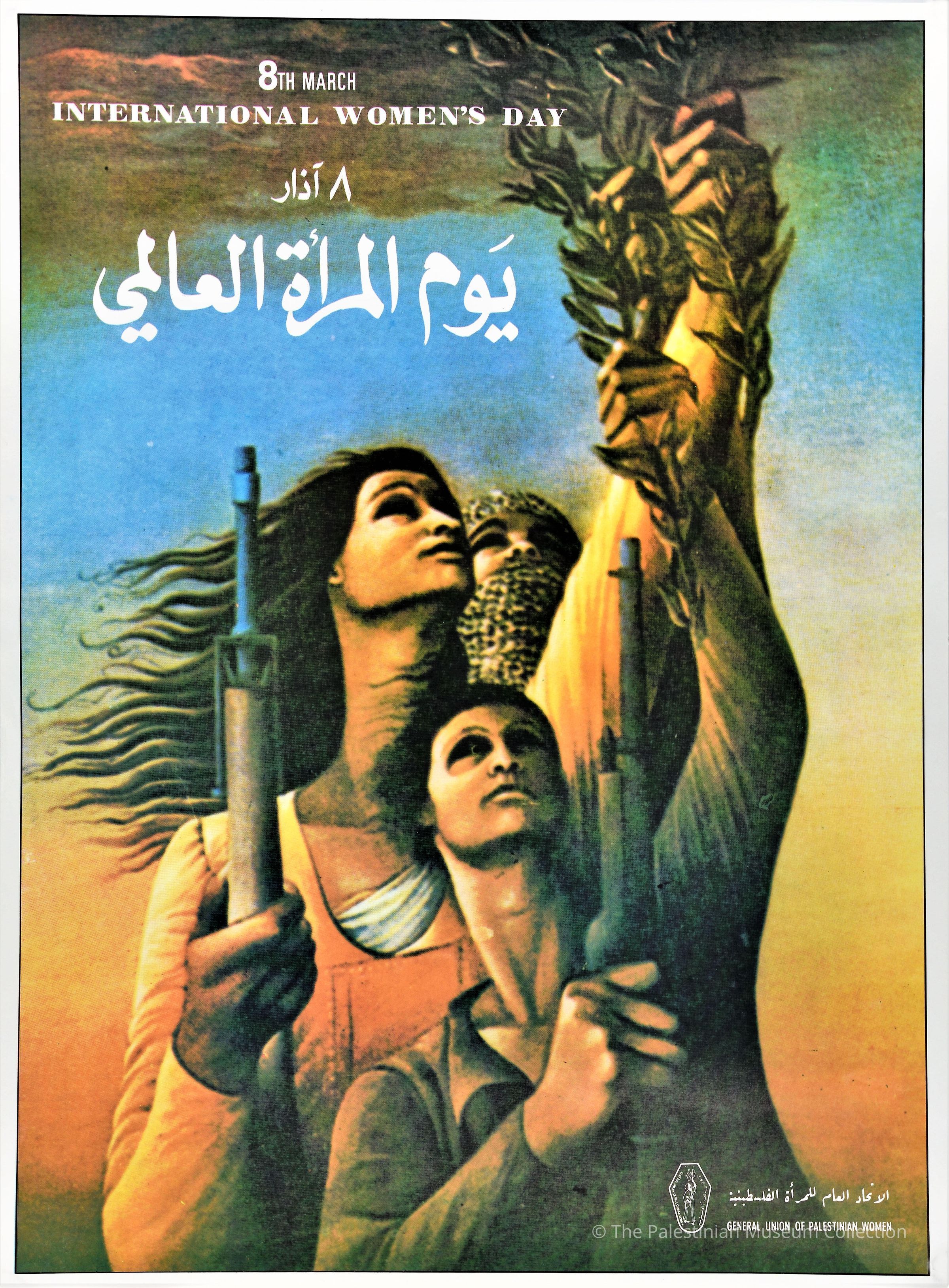 ملصق صادر عن الاتحاد العام للمرأة الفلسطينية عام 1989 بمناسبة اليوم العالمي للمرأة. يضم الملصق لوحة للفنان الفلسطيني لسليمان منصور تُصور ثلاث نساء يُمسكن بيد غصن زيتون وبالأخرى بندقية.