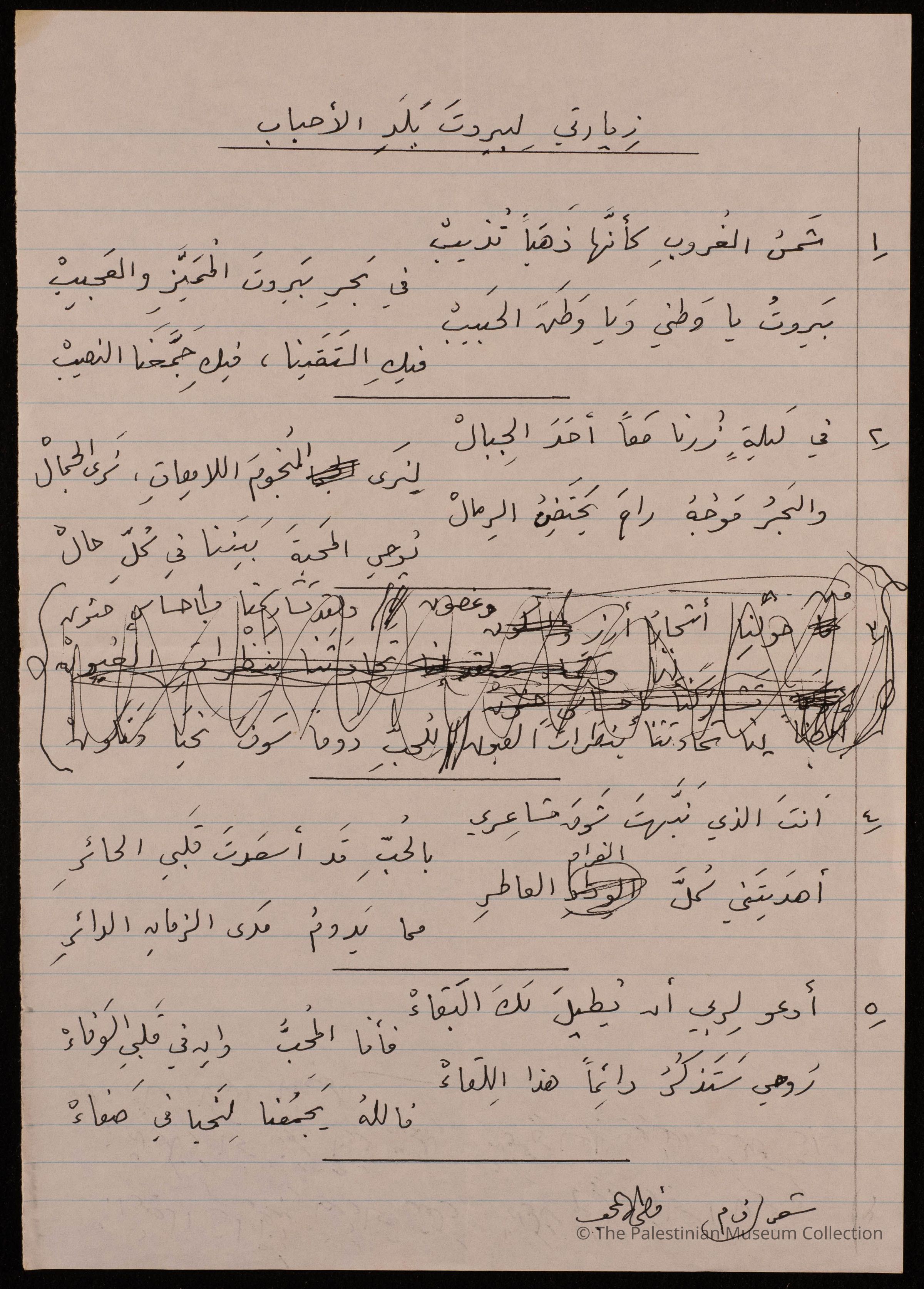 مخطوطة قصيدة باللغة العربية بعنوان " زيارتي لبيروت بلد الاحباب" للشاعرة فاطمة المحب ، ولا تحمل الوثيقة اية اشارة الى تاريخ كتابتها.