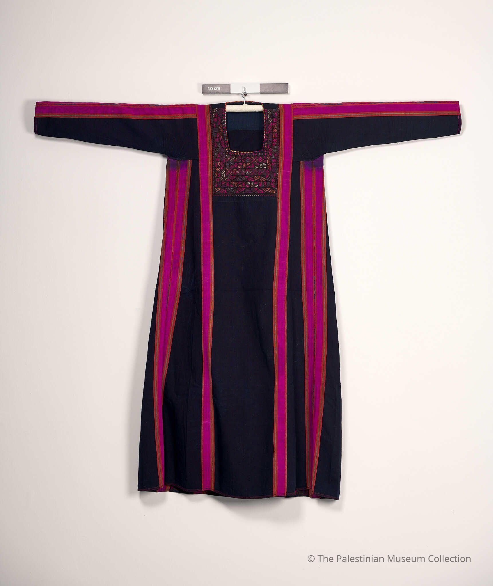 A thobe (dress) from Gaza. It is made of fuchsia and red cotton fabric from Al-Majdal, Gaza (Abu-Hizzein), and embroidered with a Fallahi (peasant) cross stitch. The chest panel of the thobe is embroidered with geometric and plant shapes. The shoulders bear no tatreez (embroidery), whereas the back of the chest panel (the upper back neckline) is embroidered with bird motifs. The sleeves and the front panel are not embroidered. As for the back panel, it has a tatreez of geometric and plant shapes and bird motifs. The sides (al-Banayiiq) have no embroidery.Made/Created