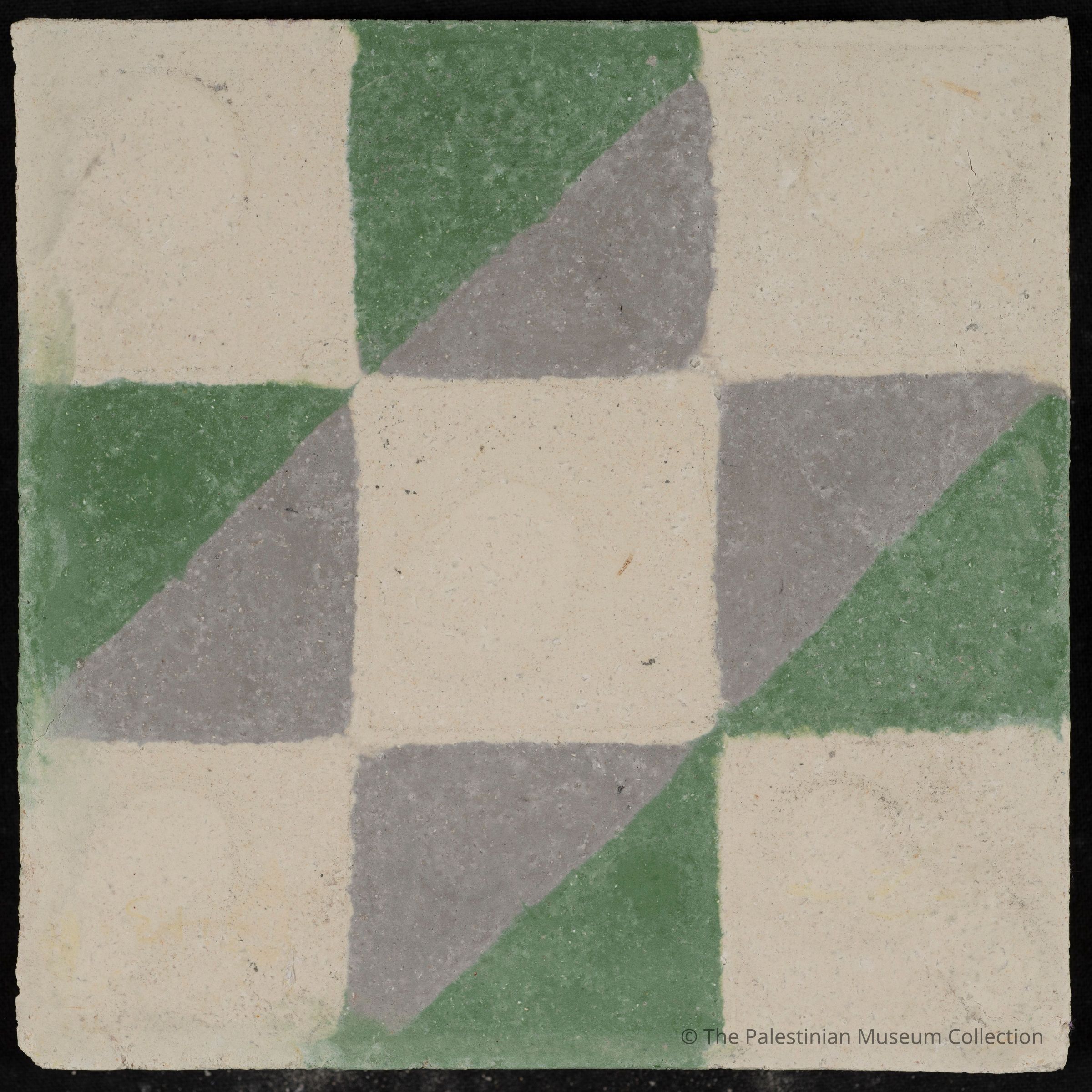 A 20 × 20 cm coloured cement tile featuring "Ad-Dammah" design. This tile is a contemporary reproduction, cast using an original mold from the Aslan Tile Factory in Nablus. The mold has been in use for almost ten years, upon the request of the factory's customers.Made/Created