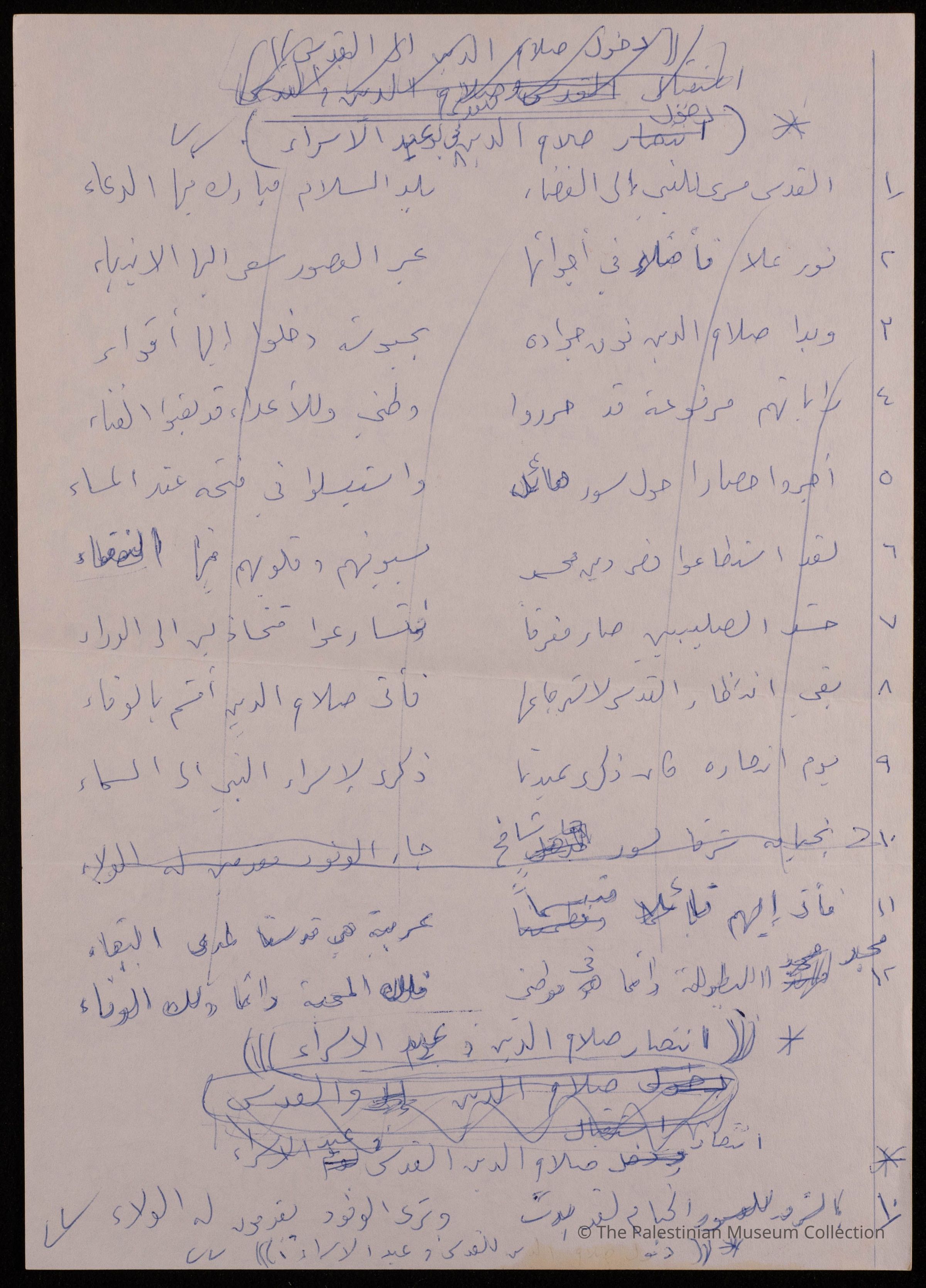 مخطوطة باللغة العربية بعنوان" دخول صلاح الدين يوم عيد الاسراء" للشاعرة فاطمة المحب، ولا تحمل الوثيقة اية اشارة الى تاريخ كتابتها.