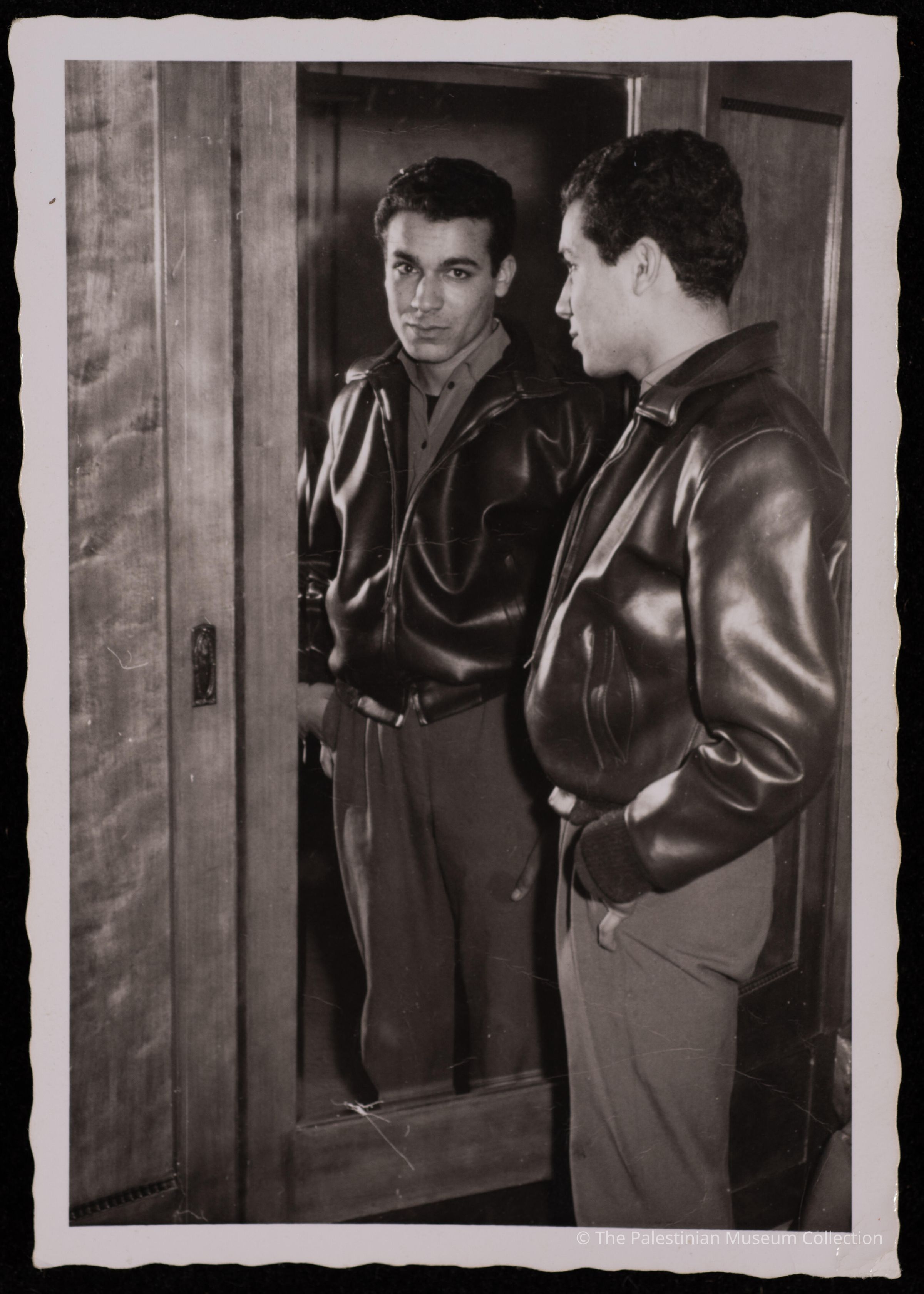 صورة غير ملونة، يظهر فيها ابراهيم قزوز واقفا امام المرآة، مرتدي ملابس يومية