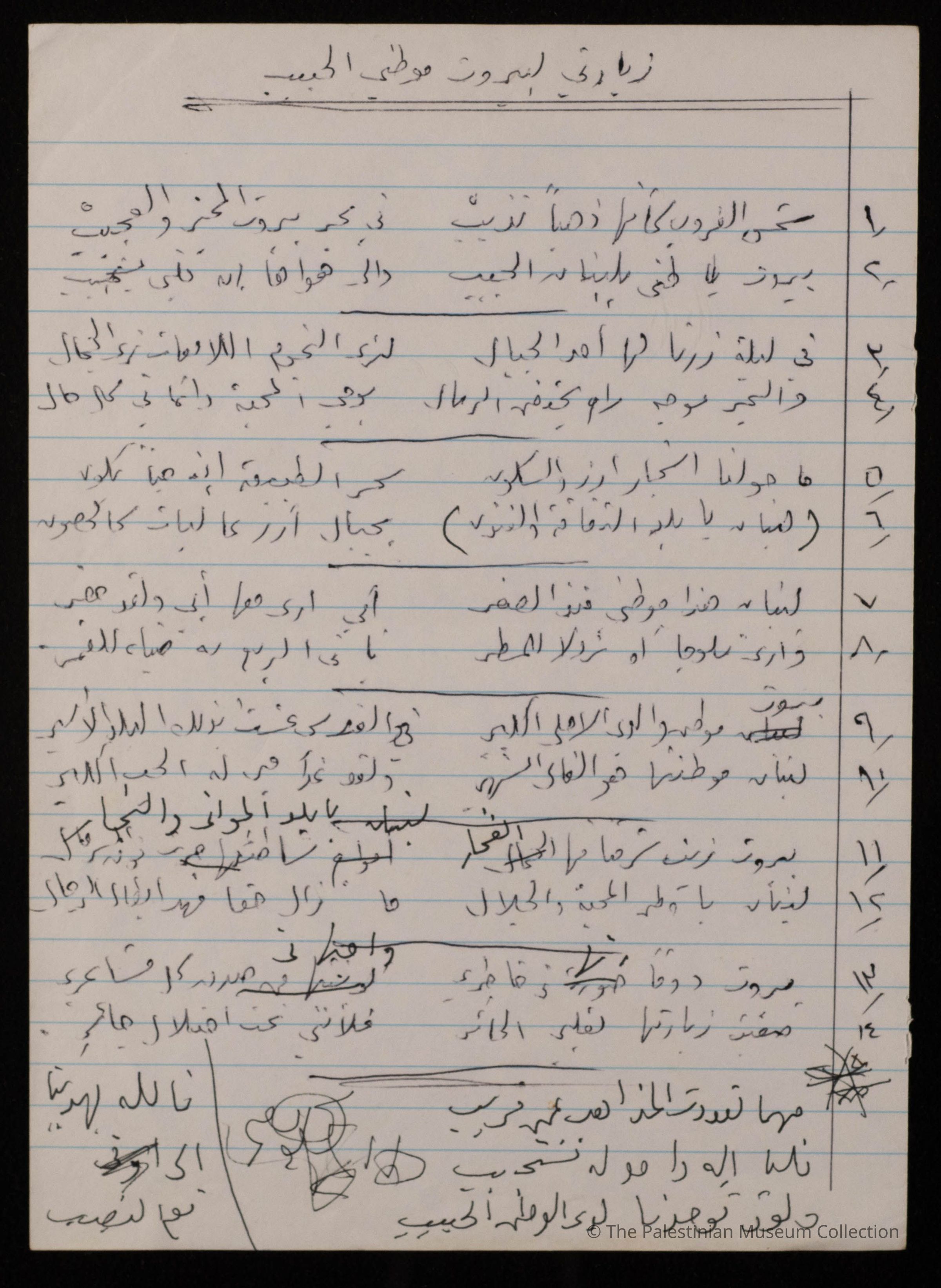 مخطوطة قصيدة باللغة العربية بعنوان " زيارتي لبيروت موطني الحبيب" للشاعرة فاطمة المحب، ولا تحمل الوثيقة اية اشارة الى تاريخ كتابتها.