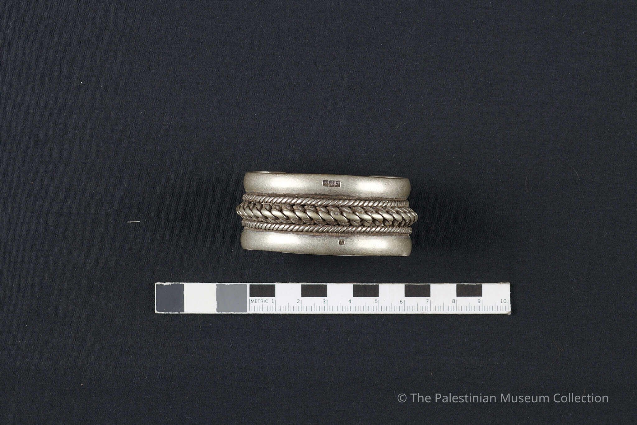 A broad handcrafted bracelet of high-calibre silver consisting of five parts, including two unengraved edges and three braided middle sections, two thin and one thick. The bracelet bears a stamp that determines the quality of silver. It was widespread in the Naqab desert, and its design was influenced by European braceletsMade/Created