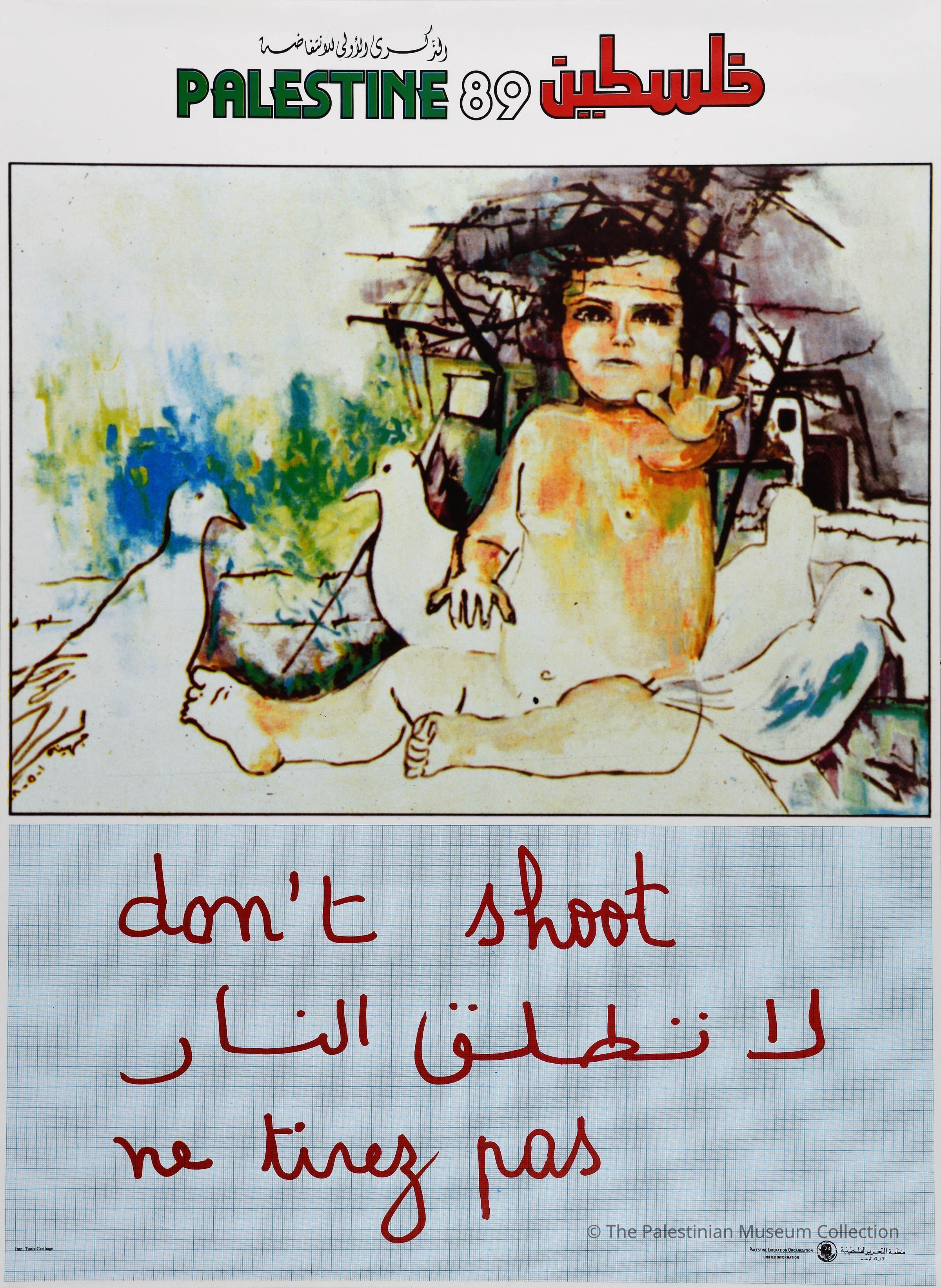 ملصق ملون، يظهر فيه طفل صغير جالس على الأرض وبجانبه بعض الحمامات، وقد رفع يده للأمام في إشارة لإيقاف إطلاق النار.