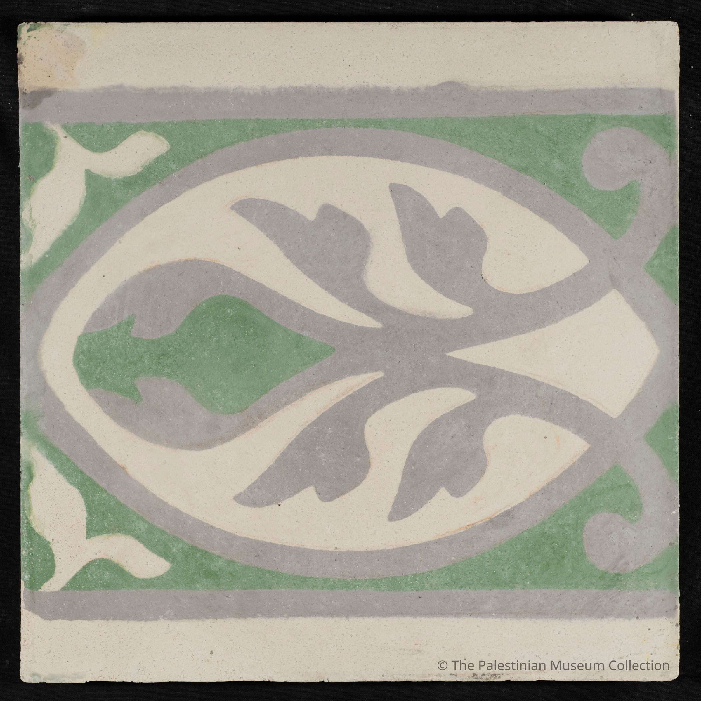 بلاطة زنار إسمنتيّة ملوّنة بحجم 20 × 20 سم. وهي نموذج حديث سُكبت في قالب يمتلكه مصنع أصلان للبلاط في نابلس يعود إلى عشرينيات القرن العشرين.Made/Created
