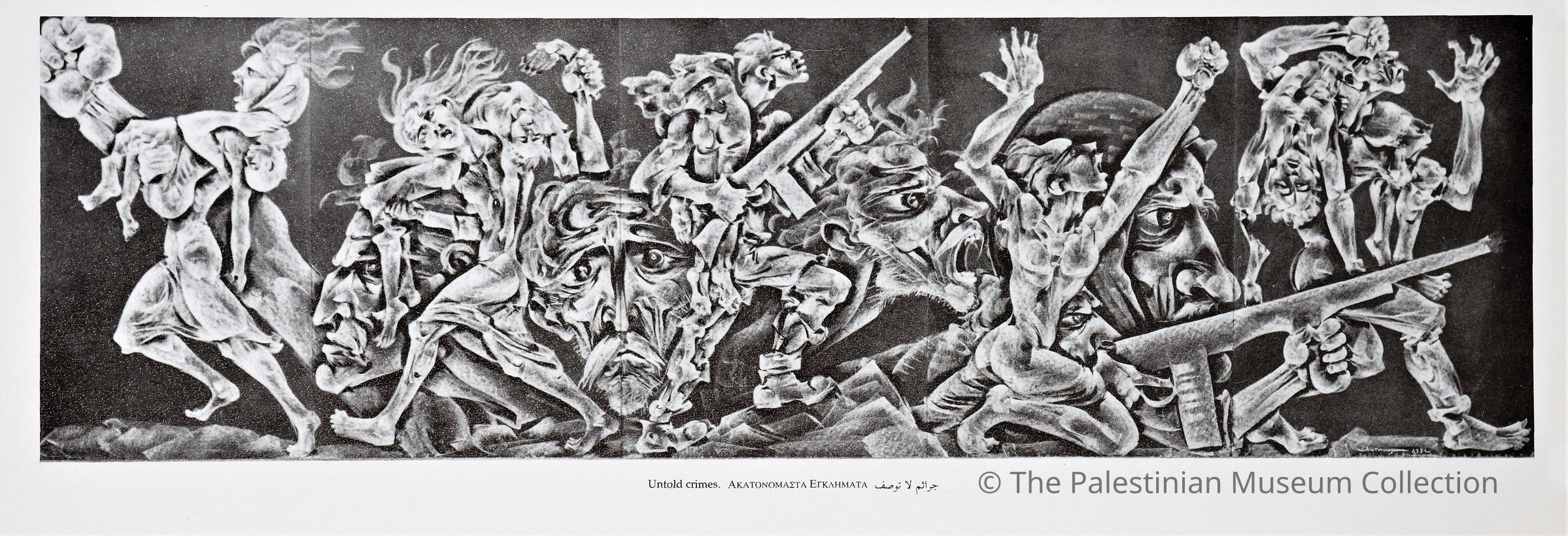 ملصق غير ملون، عبارة عن لوحة فنية، يظهر فيه مجموعة من المقاتلين والمقاتلات، بحملون البنادق والشهداء.