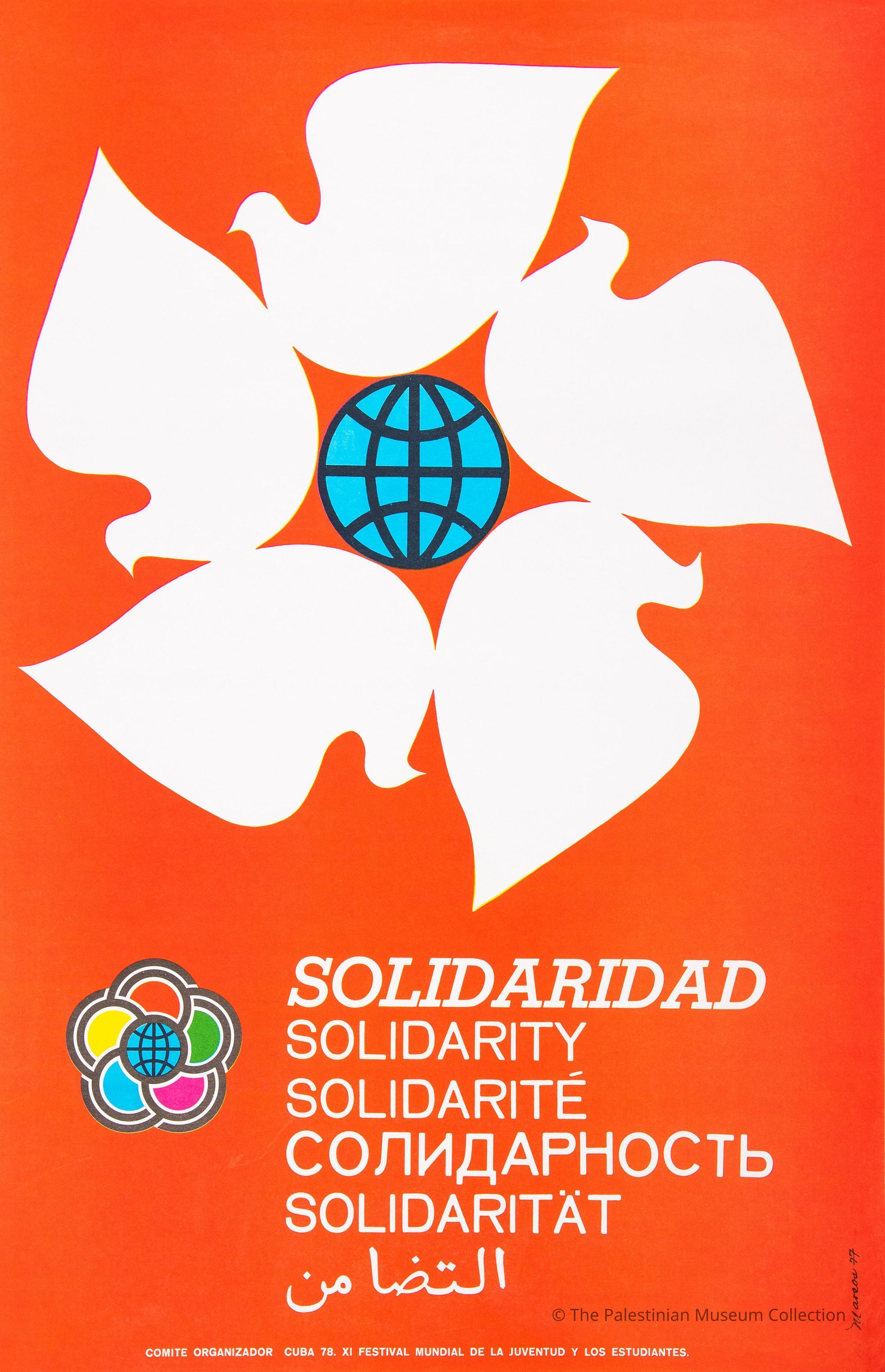 مُلصق بعنوان "التضامن"، صادر عن اللّجنة التنظيميّة للدورة الحادية عشرة من المهرجان العالمي للشباب والطلّاب عام 1978، وتُرجمت كلمة التضامن على المُلصق إلى عدّة لغات.