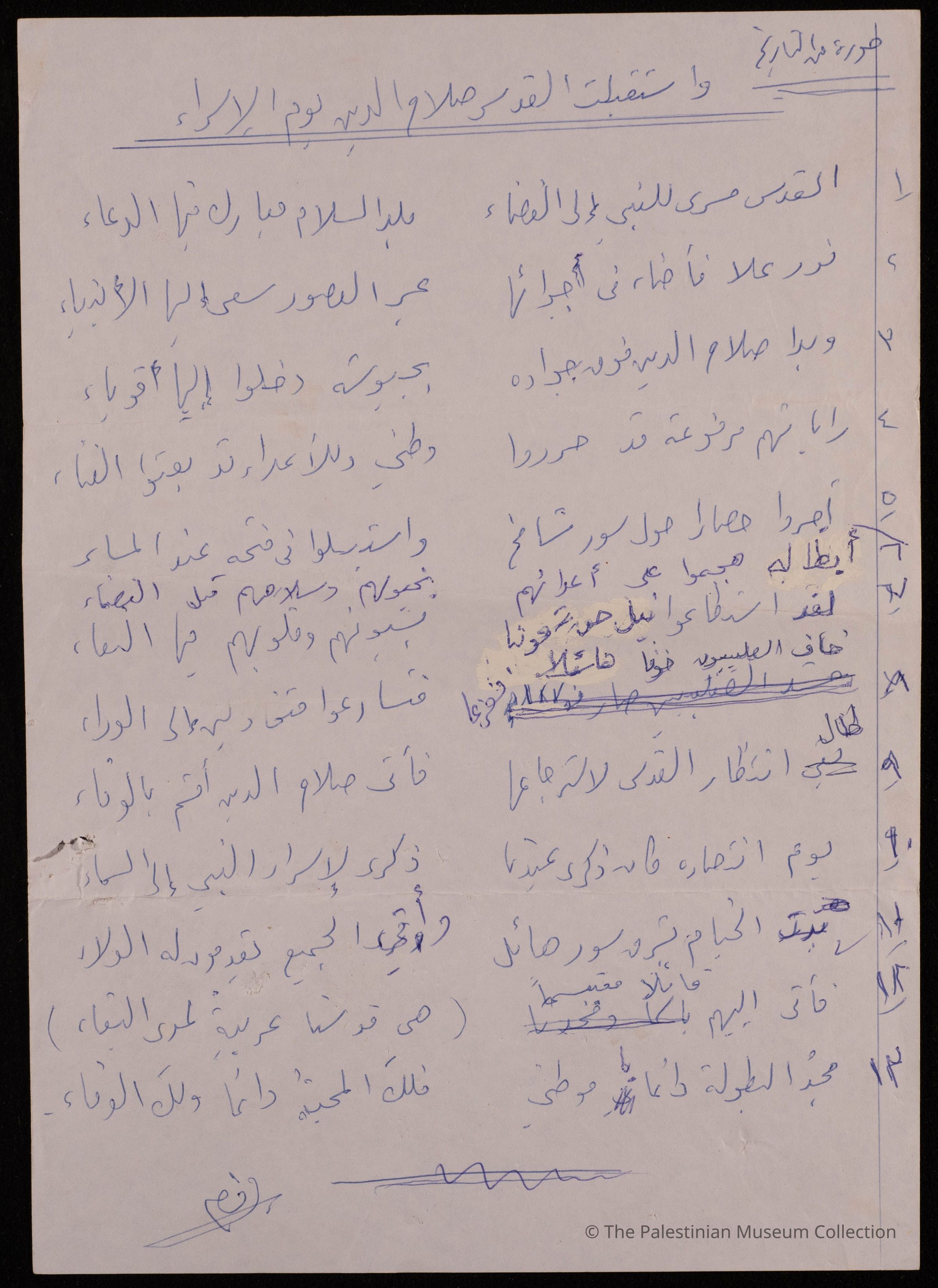 مخطوطة قصيدة باللغة العربية بعنوان" واستقبلت القدس صلاح الدين يوم الاسراء" للشاعرة فاطمة المحب ولا تحمل الوثيقة أية اشارة الى تاريخ كتابتها.