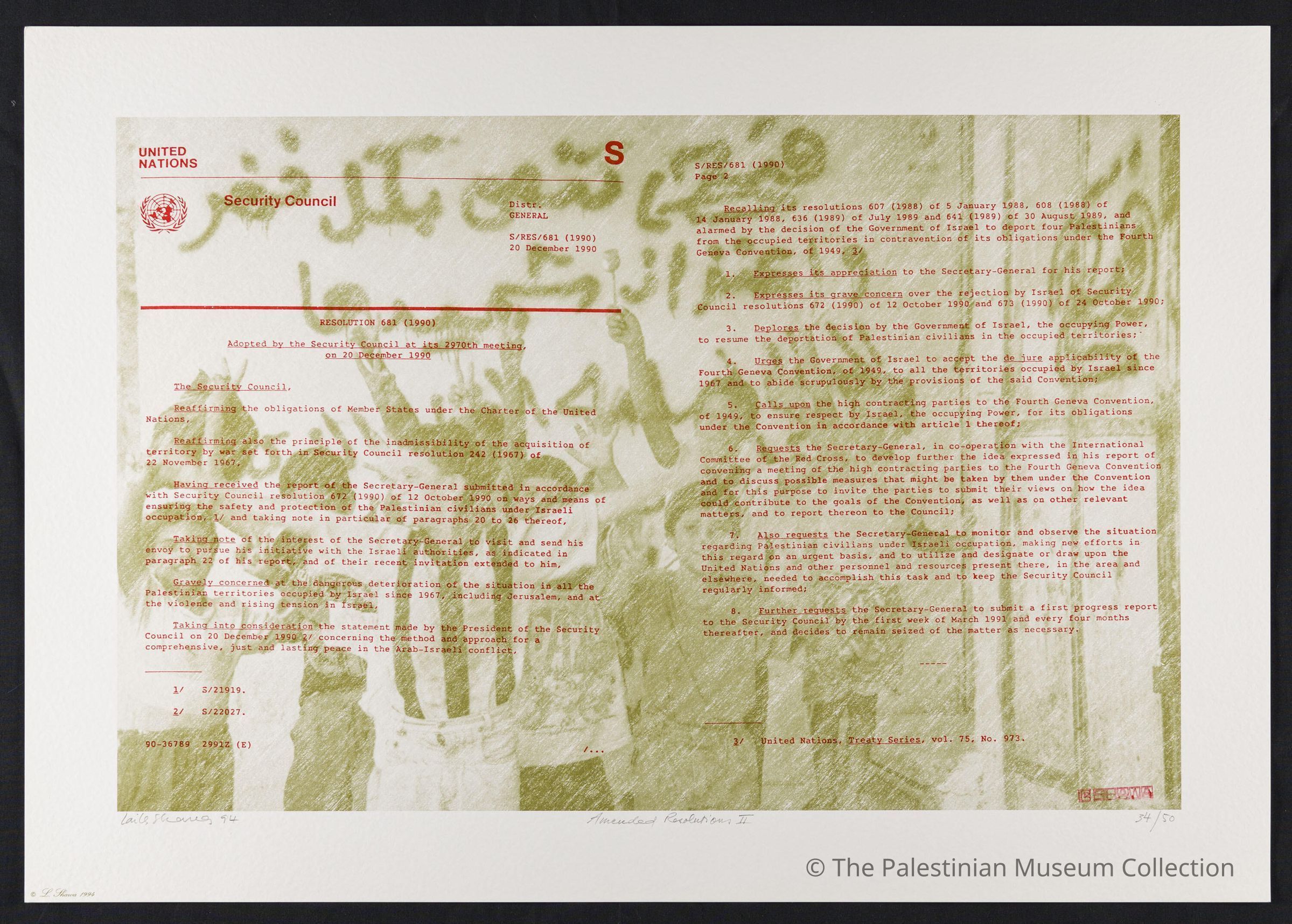 ليلى الشوّا، قرارات مُعدّلة 1، من سلسلة جدران غزّة، 1994. طباعة على ورق، 50 x 38 سم.