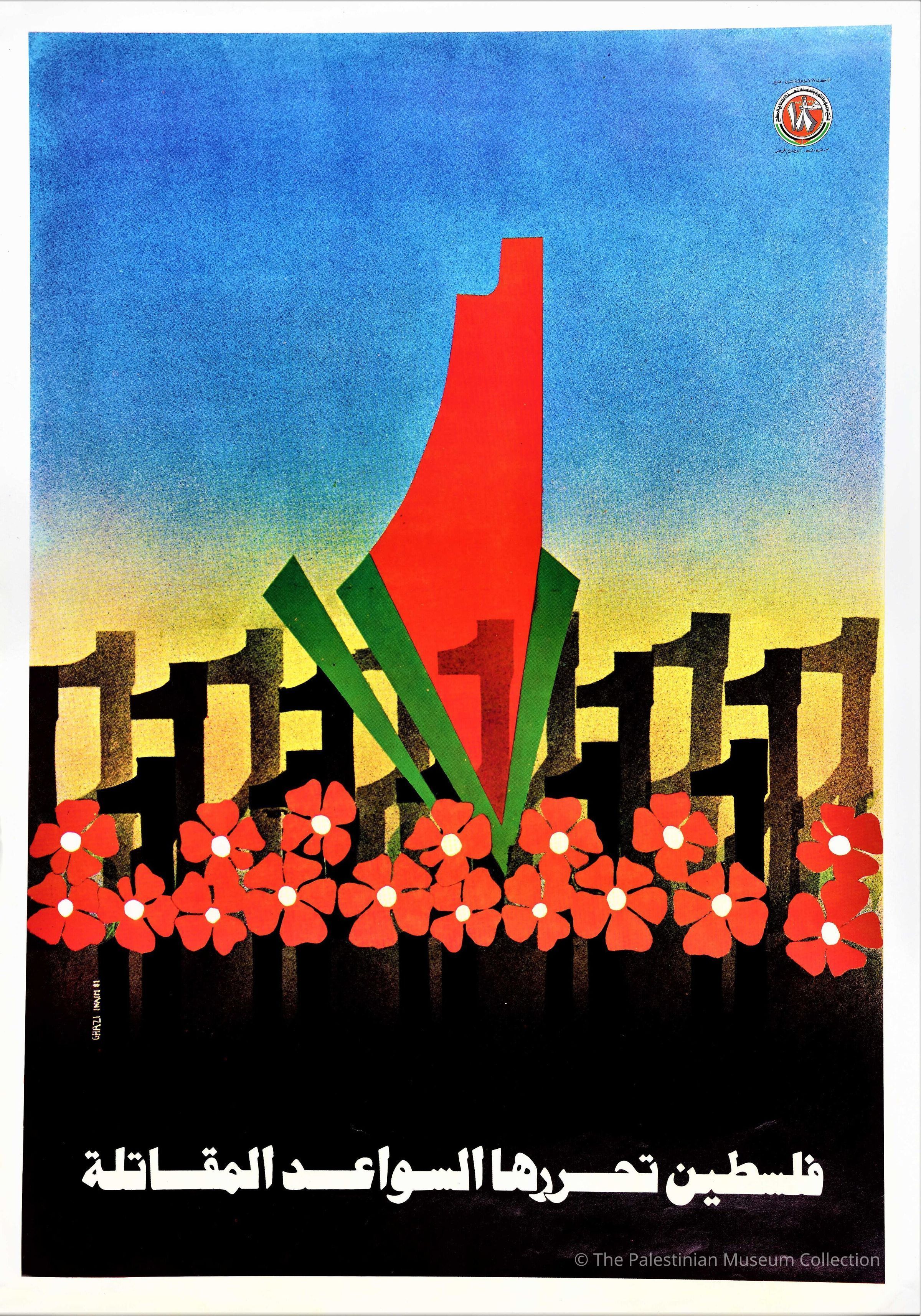 ملصق ملون، تظهر فيه خارطة فلسطين، ومن حولها الزهور ومقدمات البنادق كأتها شواهد قبور، ومكتوب على الملصق "فلسطين تحررها السواعد المقاتلة".