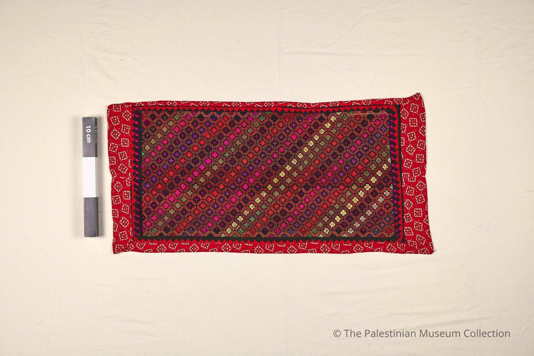 A pillowcase from the southern Hebron region, rectangular and made of red cotton and linen. It is heavily embroidered with geometric and plant shapes in the Fallahi (peasant) cross stitch using green, brown, and red silk threads.Made/Created