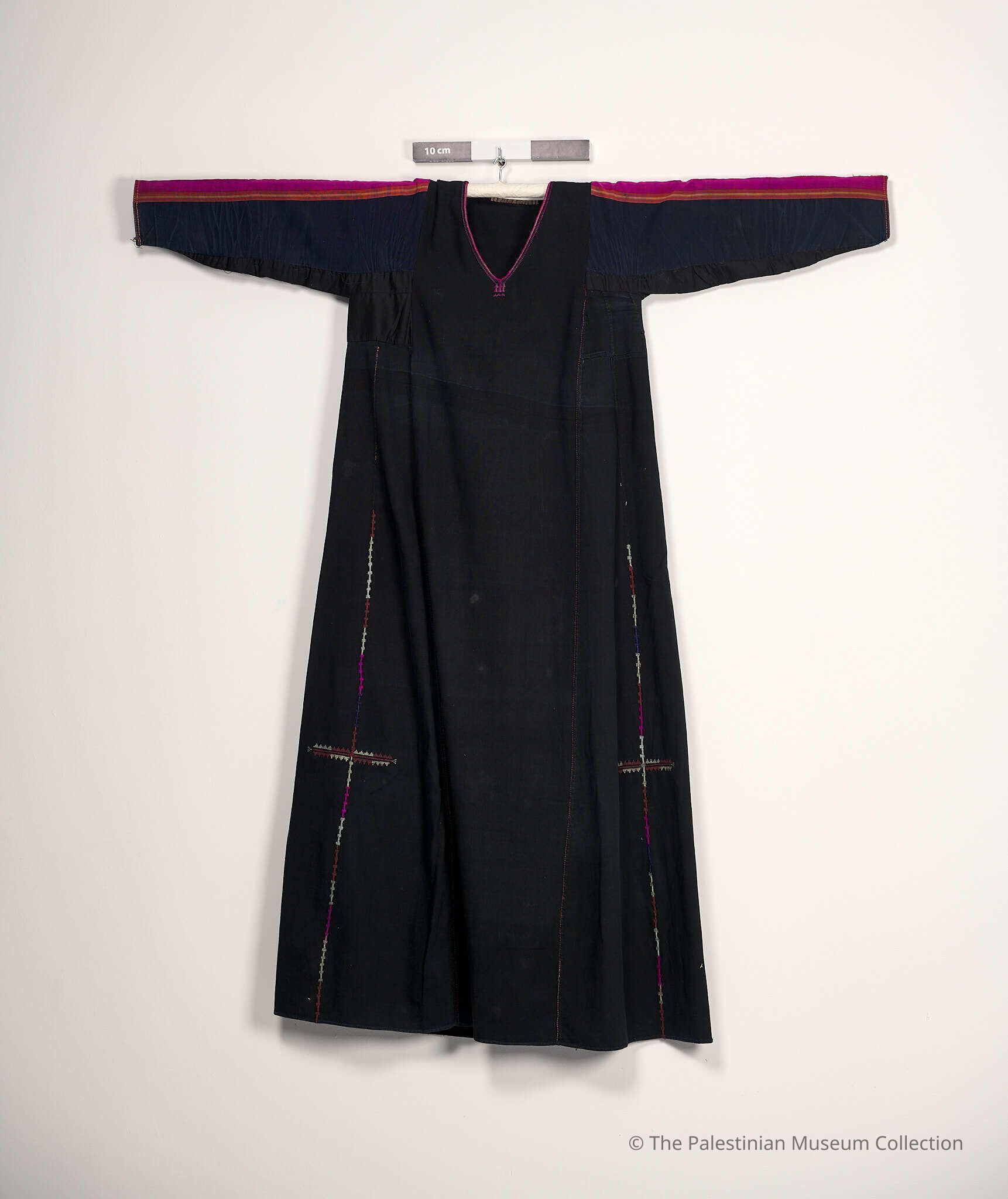 A thobe (dress) from Gaza. It is made of fuchsia, navy, and black cotton fabric from Al-Majdal, Gaza (Abu-Hizzein), and embroidered with primarily fuchsia silk threads. The chest panel of the thobe is embroidered with amulets pendant motifs. As for the shoulders and the back panel of the thobe (the upper back neckline), they bear no embroidery. The sleeves are made of fuchsia, orange, and beige cotton (majdalawi). The front panel has no tatreez (embroidery), whereas the back panel has a tatreez of geometric shapes dominated by fuchsia color. The sides (al-Banayiq) are embroidered with manajil (sickles) motifs and geometric shapes in red and white.Made/Created