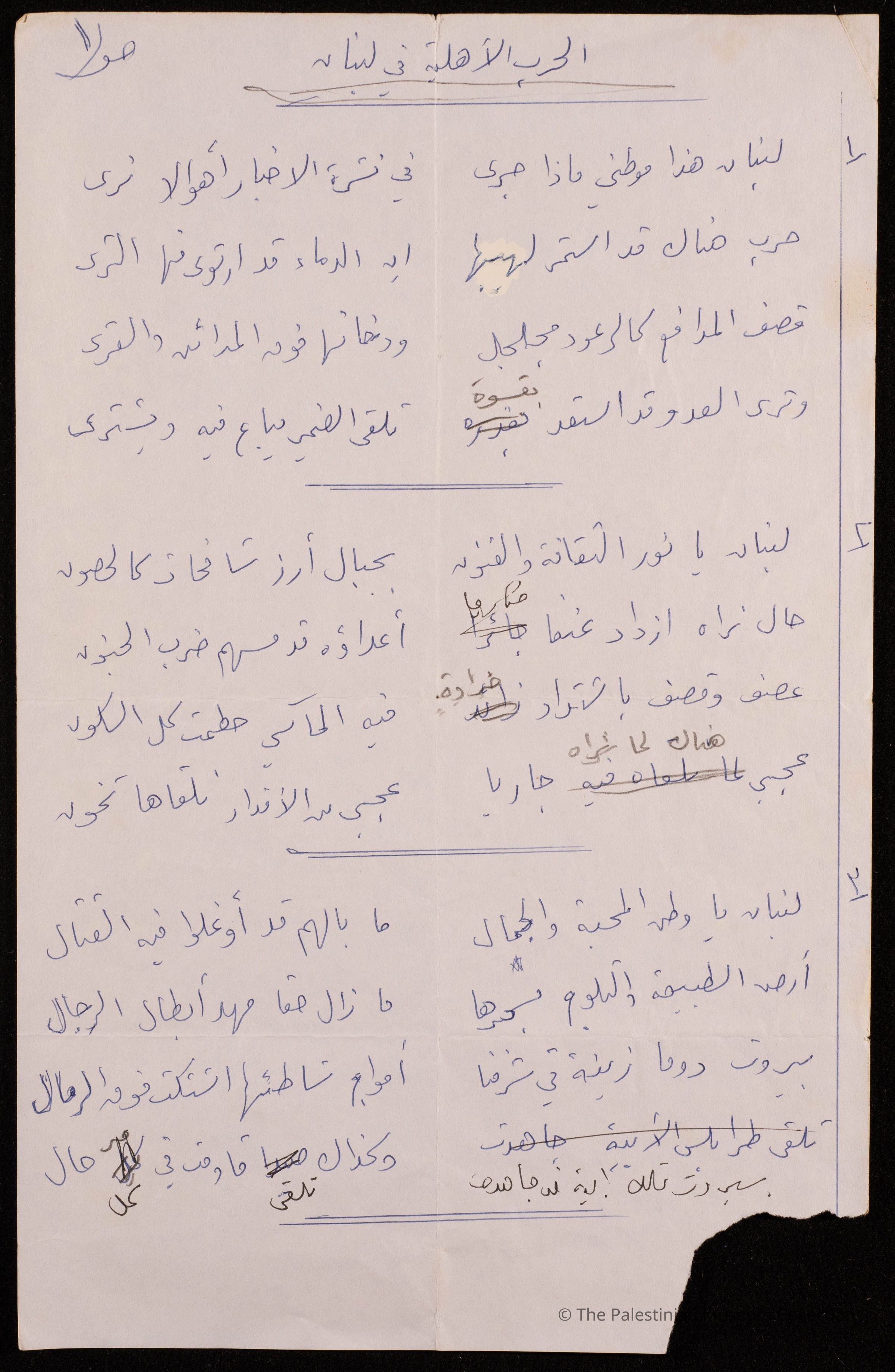 مخطوطة قصيدة باللغة العربية بعنوان" الحرب الاهلية في لبنان" للشاعرة فاطمة المحب، ولا تحمل الوثيقة اية اشارة الى تاريخ كتابتها.
