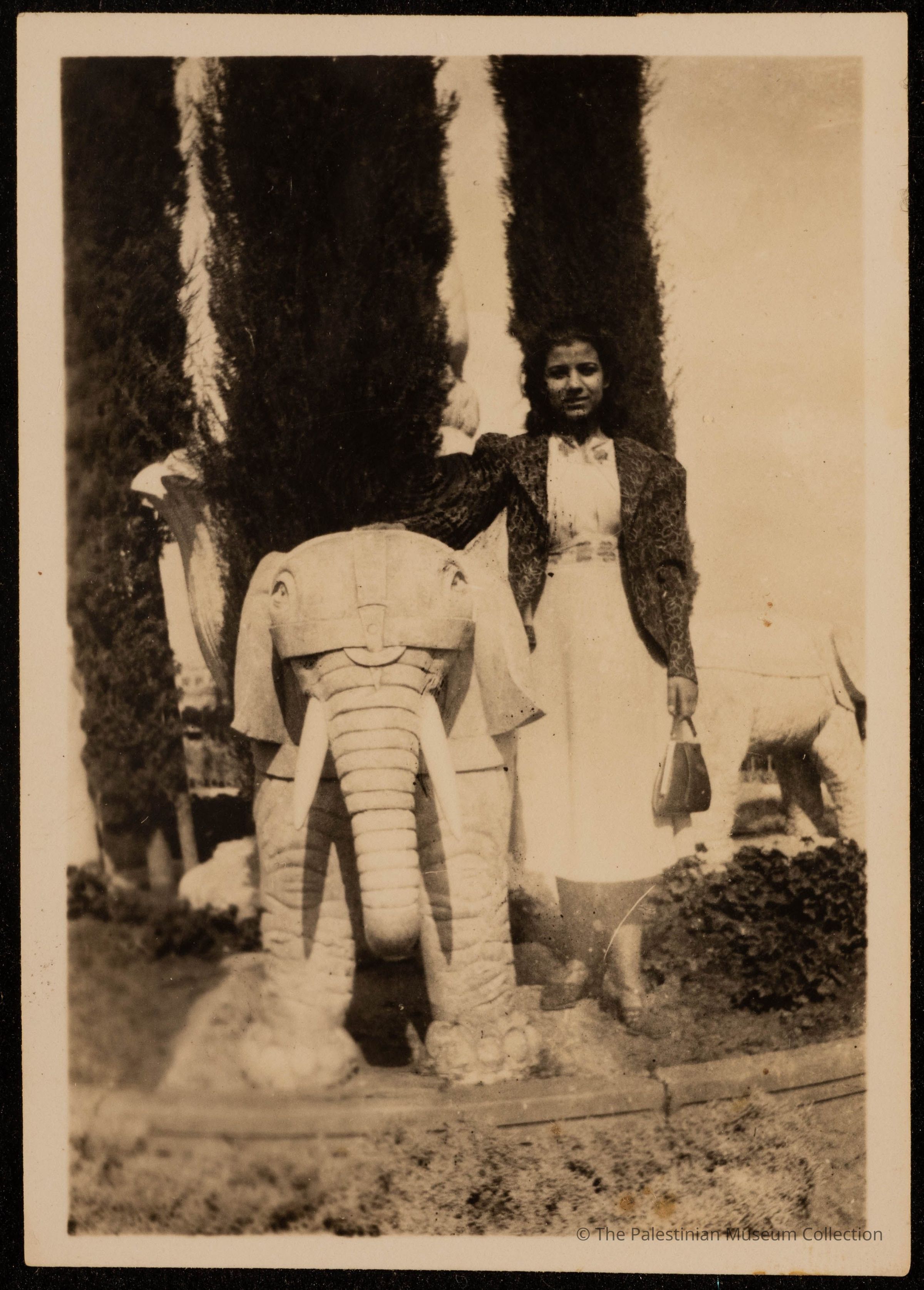 صورة الفنانة فاطمة المحب بجانب تمثال فيل