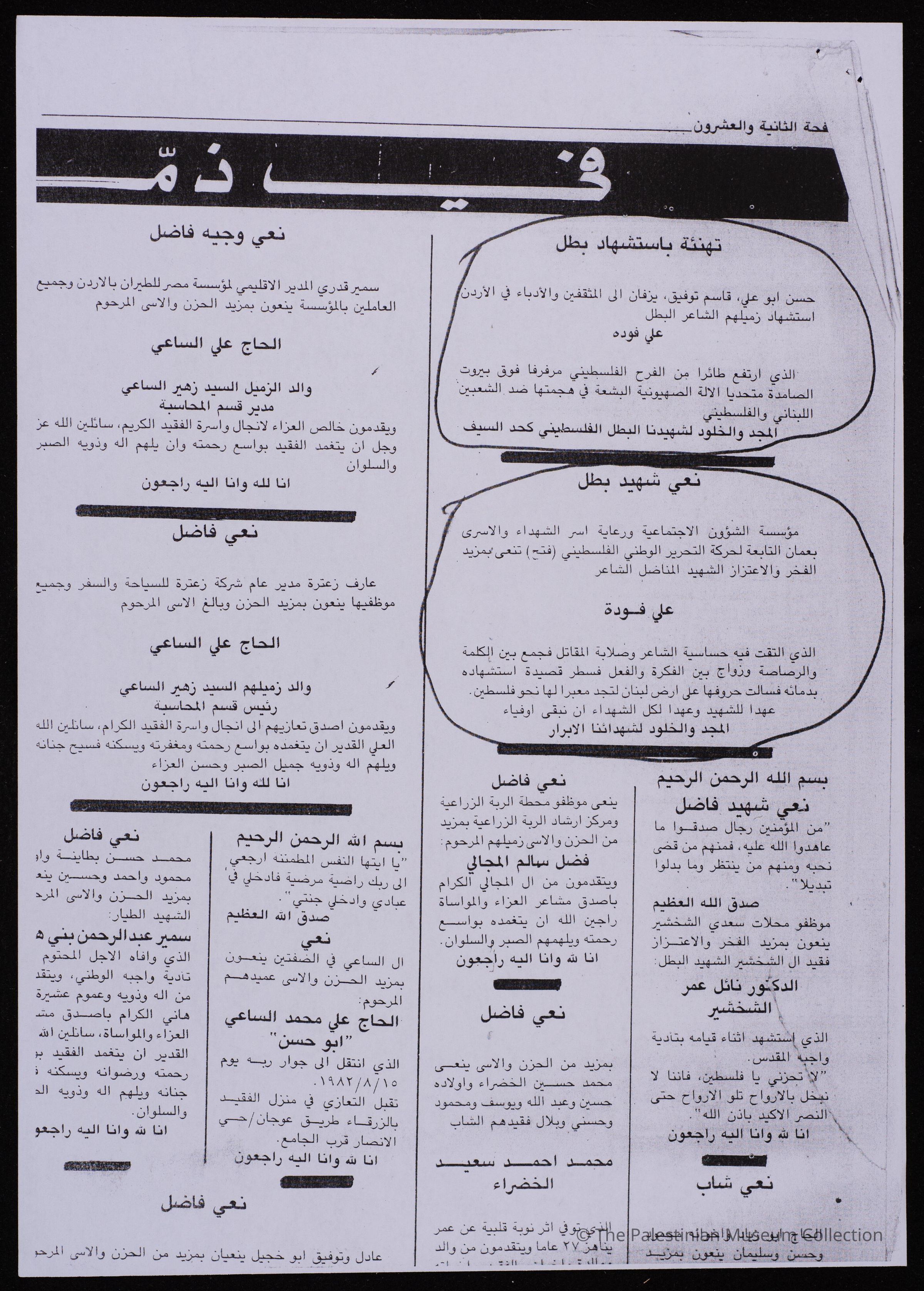 قصاصة من جريدة تحتوي على تهنئة باستشهاد الشاعر علي فودة، بالإضافة إلى نعي شخصيات أخرى.