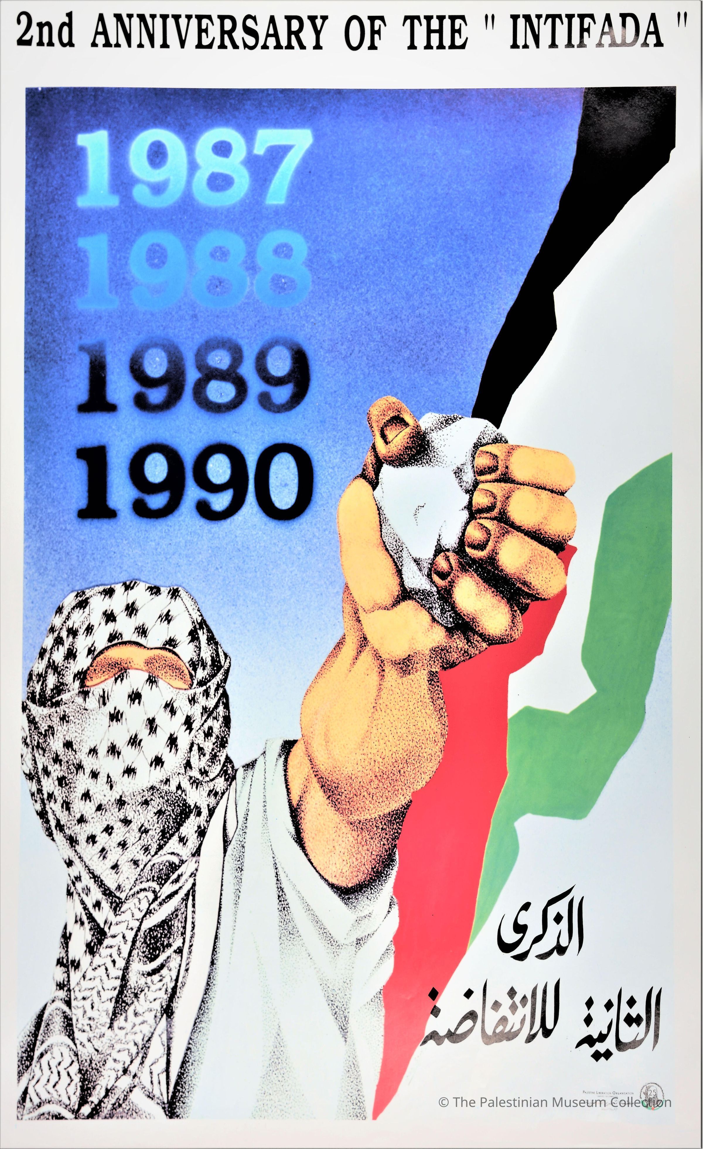 Published on the 2nd anniversary of the First Intifada, this colour poster shows a masked man with a stone in his hand and the Palestinian flag to his side. Number of duplicates: 1