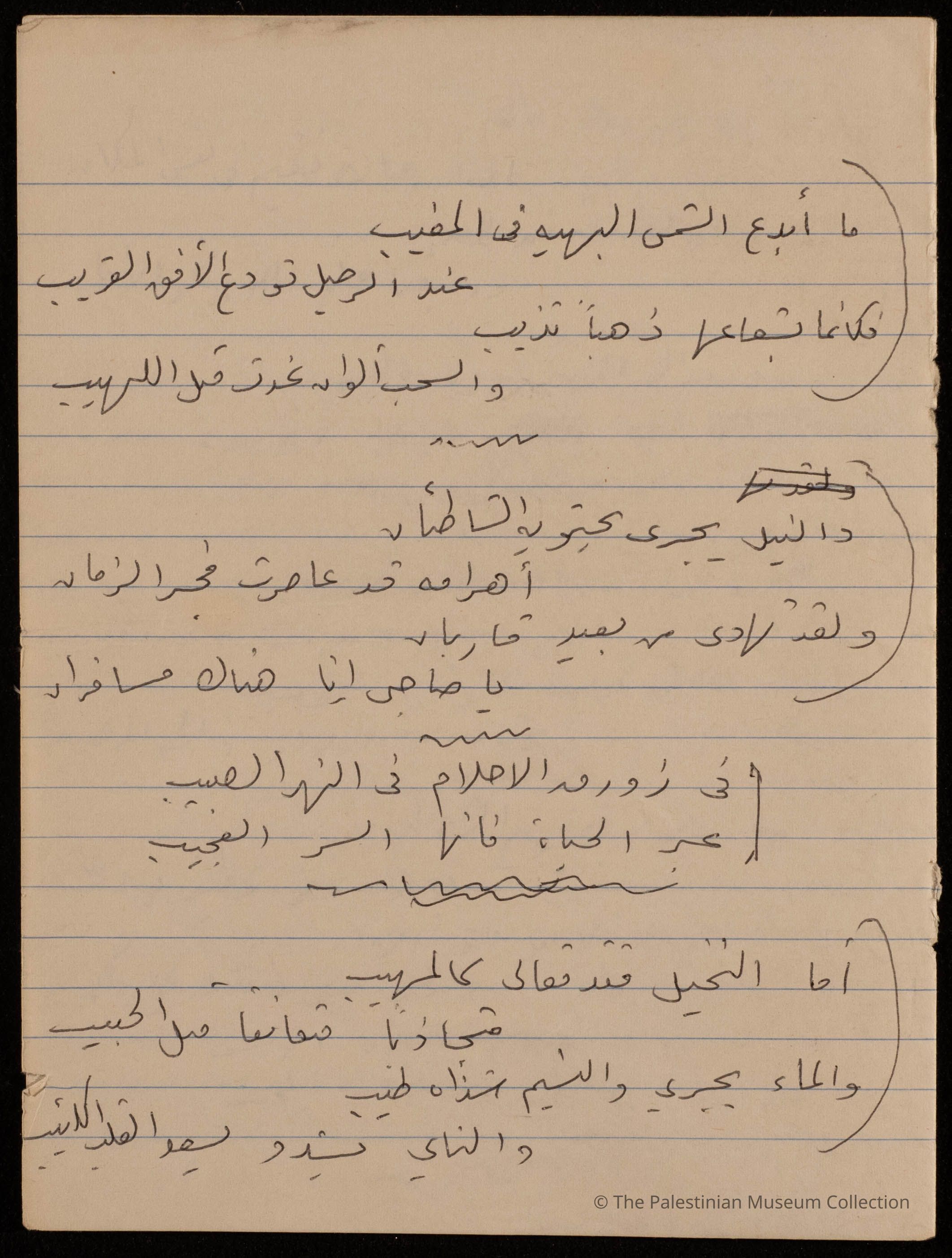 مخطوطة قصيدة باللغة العربية بلا عنوان للشاعرة فاطمة المحب، ولا تحمل الوثيقة اية اشارة الى تاريخ كتابتها.