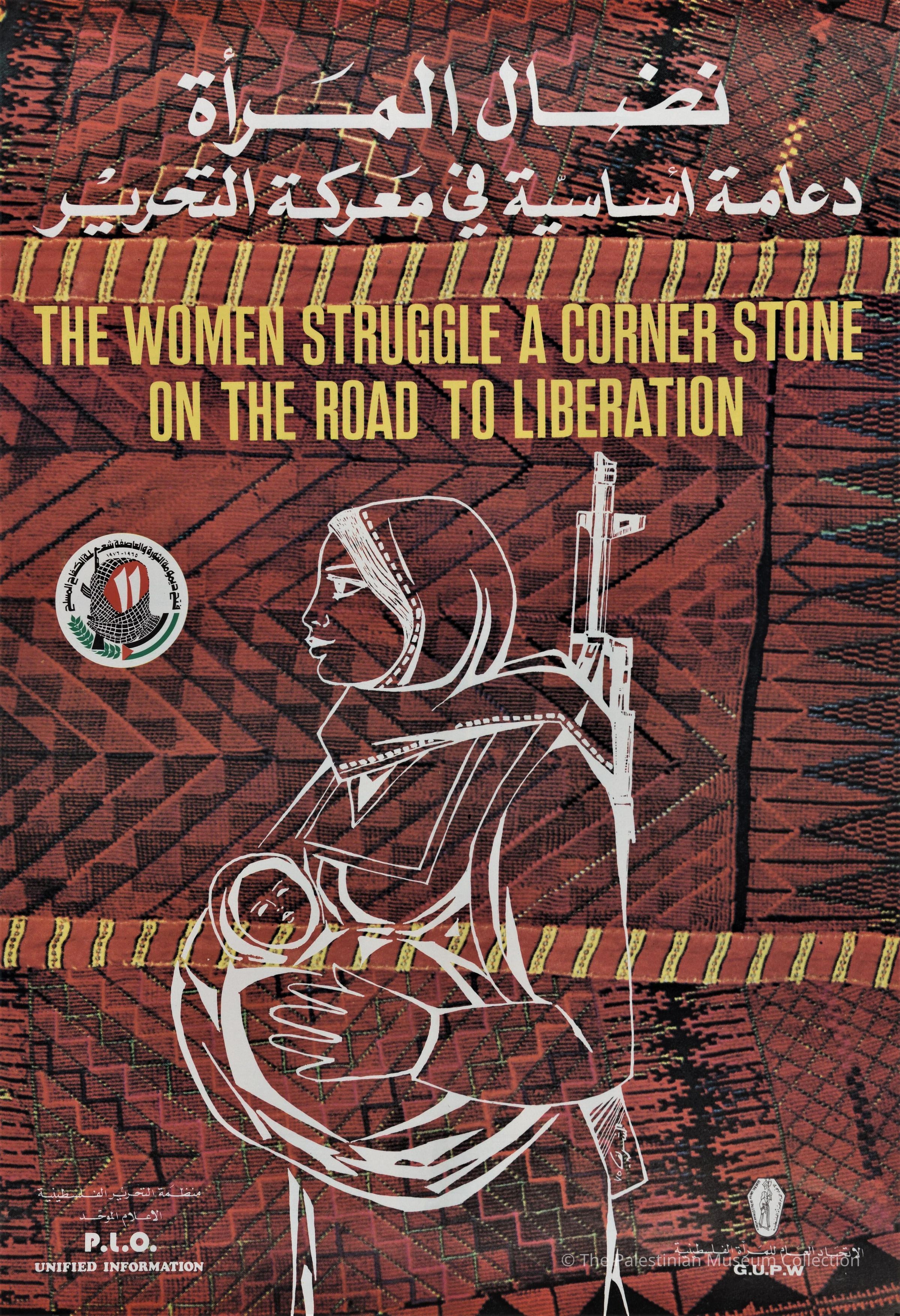 ملصق ملون، يظهر امرأة تحمل البندقية على ظهرها، وبين يديها طفلها الرضيع، الخلفية عبارة عن قطعة مطرزة من الثوب الفلسطينين التقليدي، نشر لتأكيد على أهمية وجود المرأة في النضال. (يوجد ملصق آخر منه)