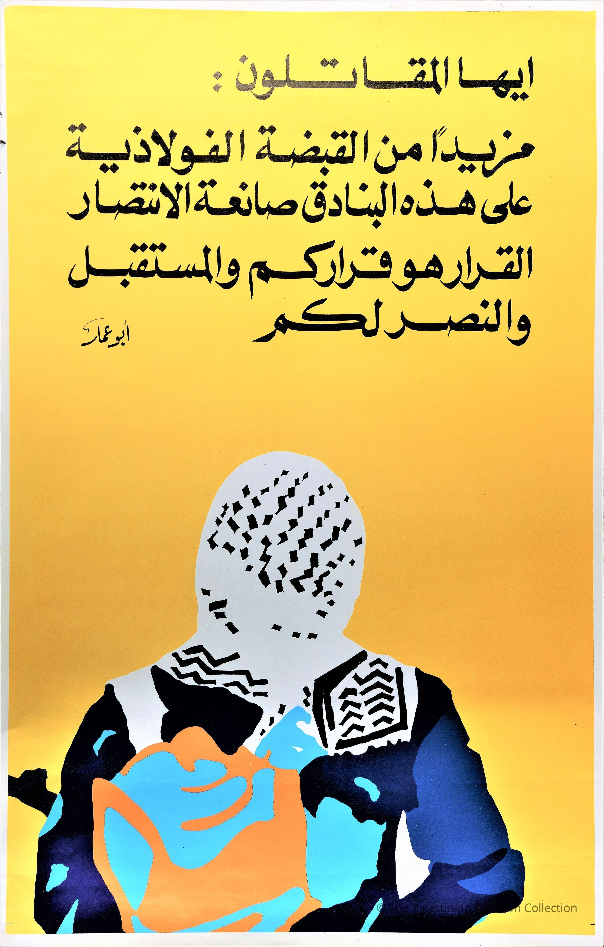 A colour poster showing a man holding a rifle; wearing a military uniform and a Kufiya. The poster is of two parts; one shows the head and back of a fighter; and a sentence on the top, while the other shows the names of the artists.Dimensions