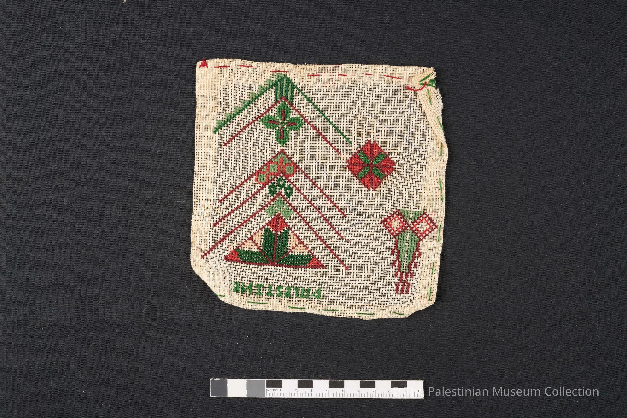 نموذج نطريز على قماش ايتامين مطرز باللون الاخضر بدرجتين والاحمر برسمات متعددة منها شجرة السرو ونجمة بيت لحم وكلمة palestine