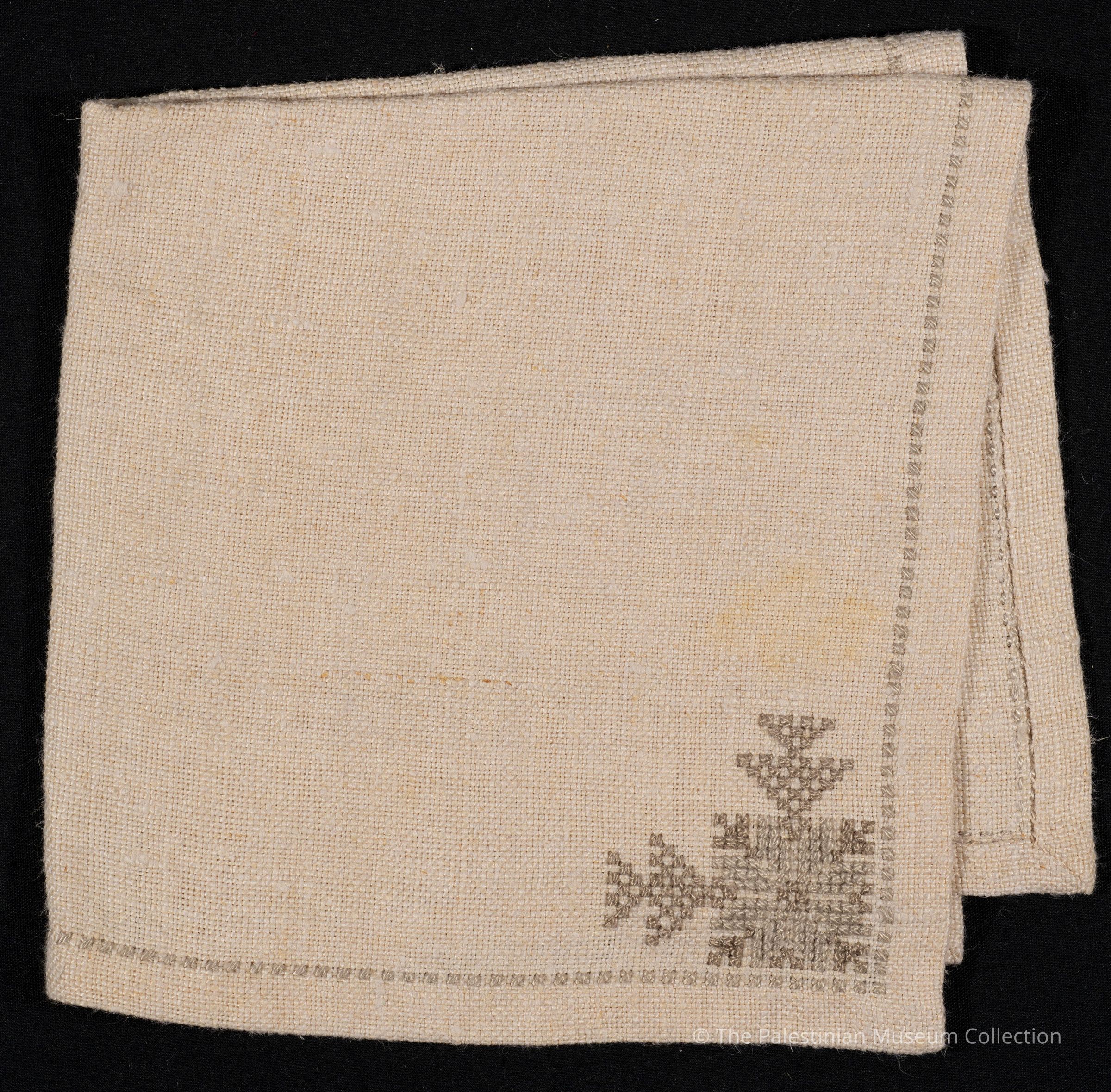 A table napkin made of beige linen. It has a light embroidery of a plant motif on its corner using the Fallahi (peasant) cross stitch. It was produced by the Arab Refugees Handicrafts Center in Jerusalem, owned by Asia Jeries Halabi.