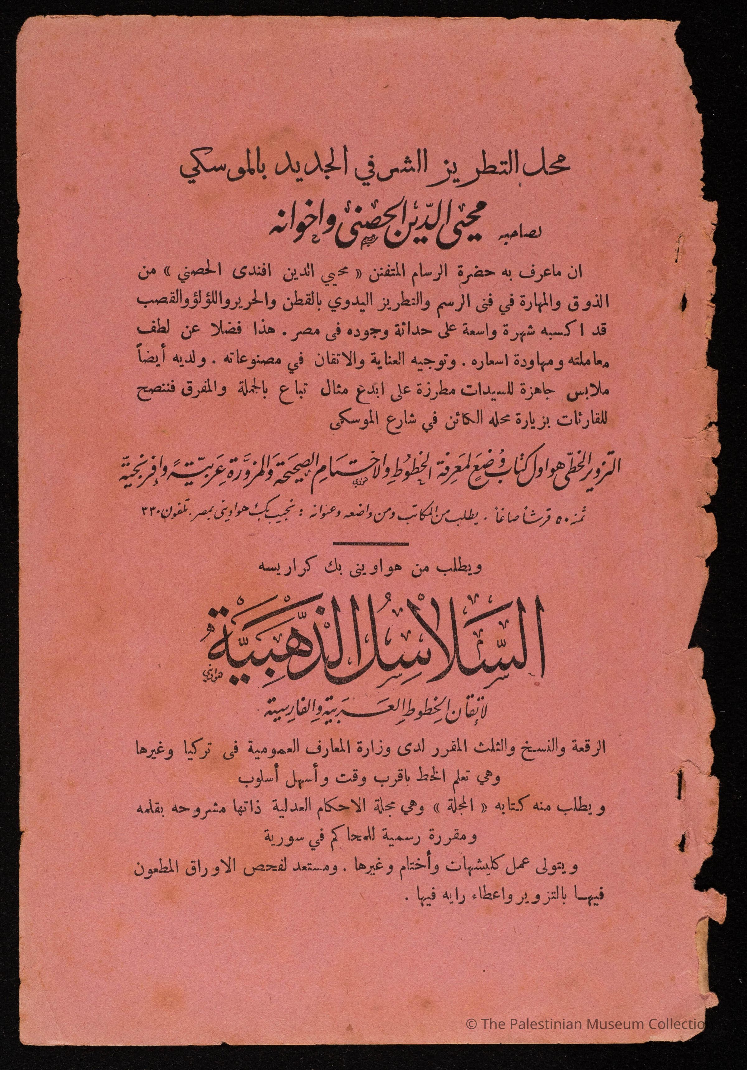 وثيقة ترويج واعلان لثلاث محلات مختلفة، الأول إعلان محل تطريز يدوي لصاحبه محيي الدين أفندي الحصني، أما الثاني فهو إعلان يخص نجيب بك هواويني لكتب وكراسات وأدوات الخط. والثالث إعلان لمكتبة العرب لصاحبها يوسف البستاني.