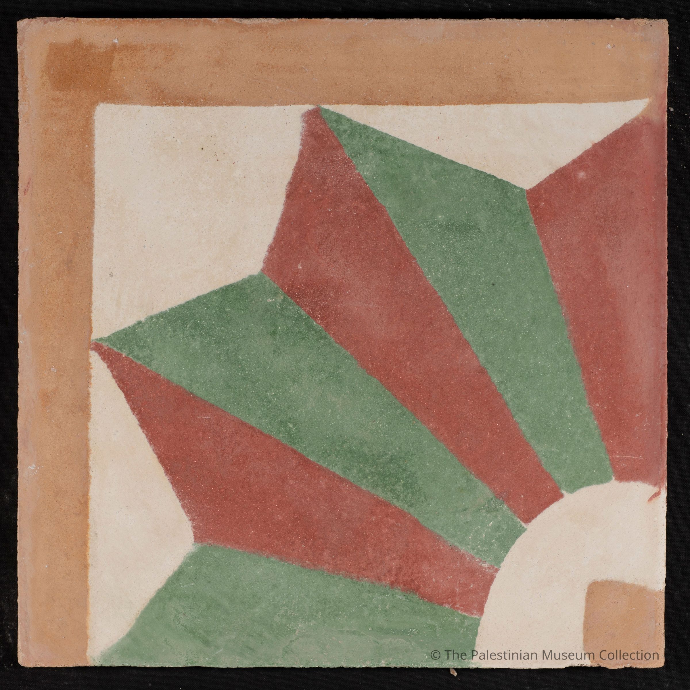 بلاطة إسمنتيّة ملوّنة بحجم 20 × 20 سم، تحمل تصميم "زاوية زنار البقلاوة"، وهي نموذج حديث سُكبت في قالب يمتلكه مصنع أصلان للبلاط في نابلس يعود إلى عشرينيات القرن العشرين.